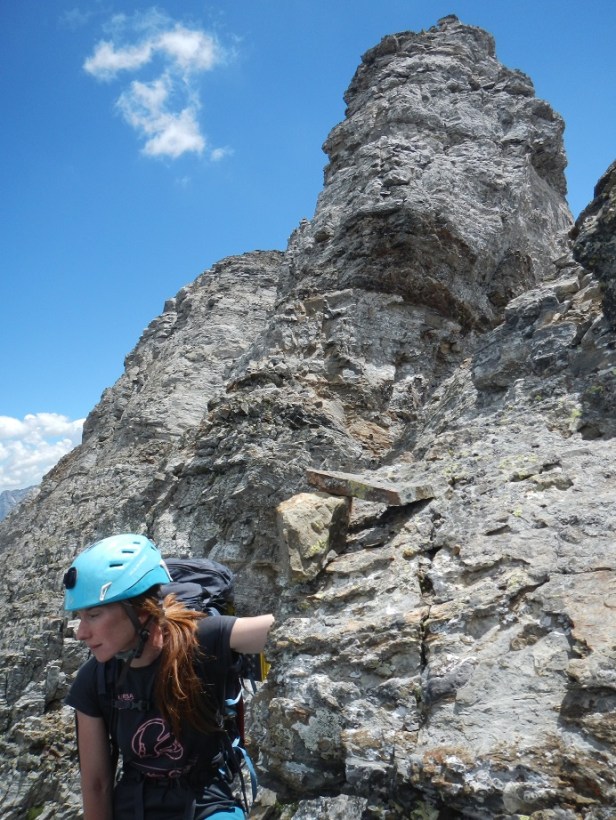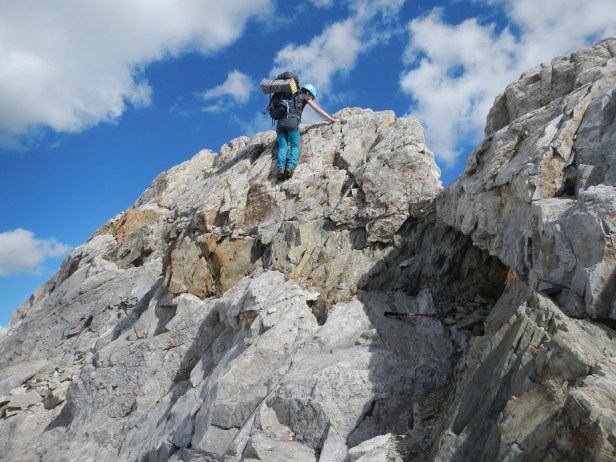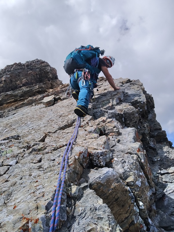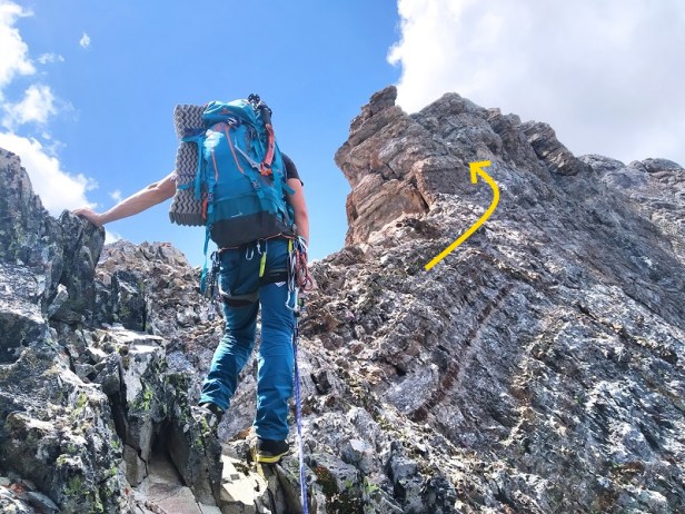 Llegando a una zona donde la roca desploma. Deberemos realizar una travesía y tomar un pequeño corredor que nos vuelve a depositar el el filo de la cresta.