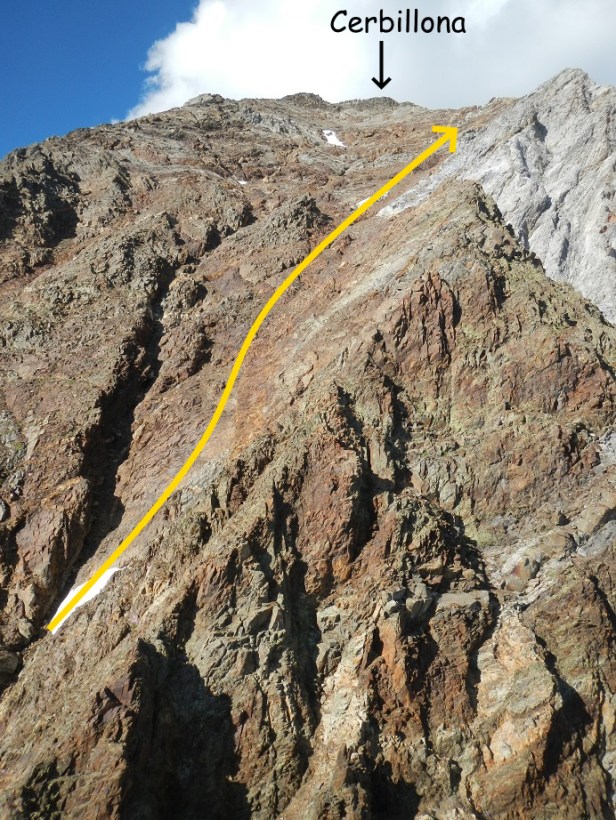 Merece mención aparte la Aguja SW Cerbillona. Desde el pico Cerbillona tendremos que descender más de 200 m por terreno muy roto, donde no tirar piedras será tarea difícil. A tener en cuenta, por el peligro que ello conlleva habiendo más gente en la zona.