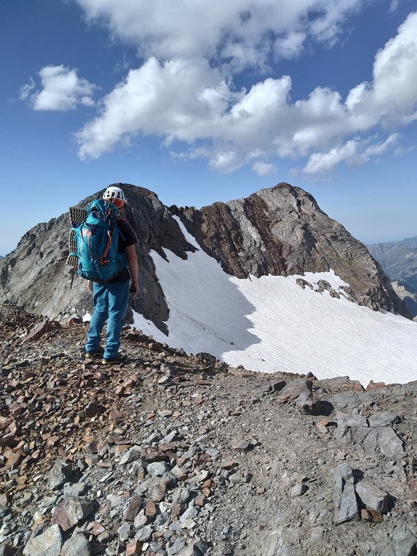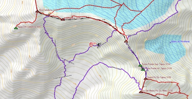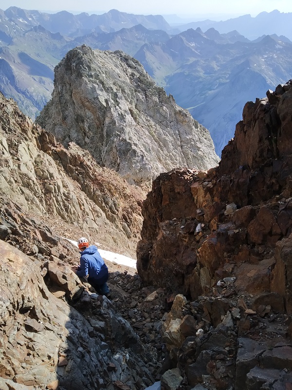 El punto más delicado lo tendremos en el descenso desde el pico Tapou hacia la Punta Inferior Tapou. En nuestro caso encontramos nieve en el corredor que separa las dos cumbres, lo que nos obligó a descender por terreno muy descompuesto con exposición al Helero de Montferrat.