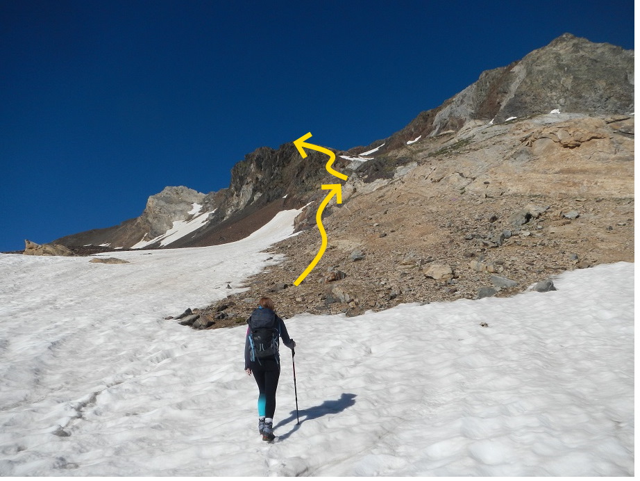 - Ir a media ladera siguiendo los hitos, para llegar al famoso paso de roca suelta y con exposición al glaciar. (Flecha roja en el croquis)