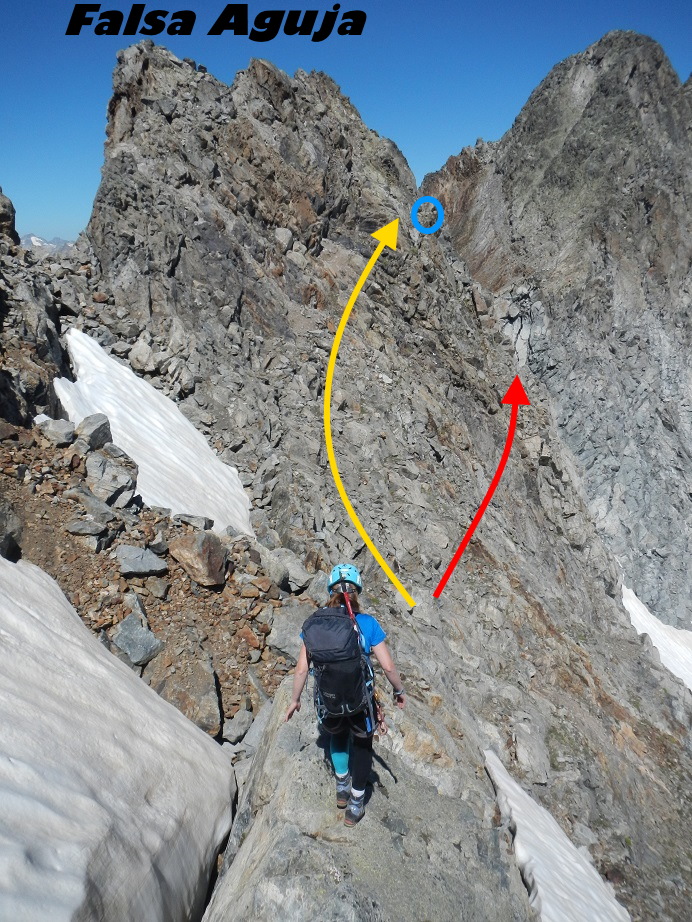 - La que seguimos nosotros. Ascender en dirección a la Falsa Aguja, pero sin necesidad de llegar a su cumbre. Encontraremos un lazo en un gran bloque sobre una chimenea inclinada. Prever lazo para rápel por si no estuviera. (Flecha amarilla en el croquis).