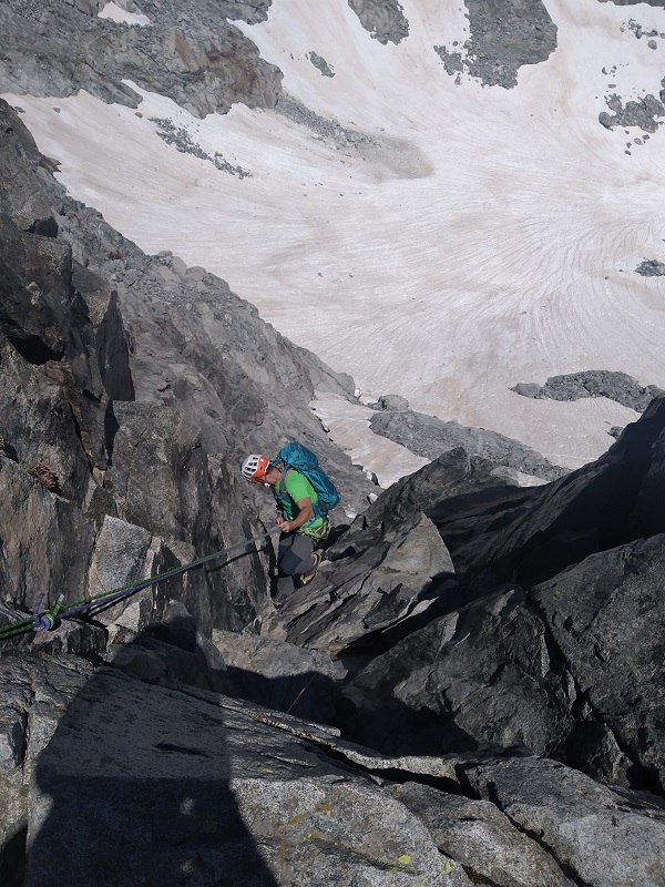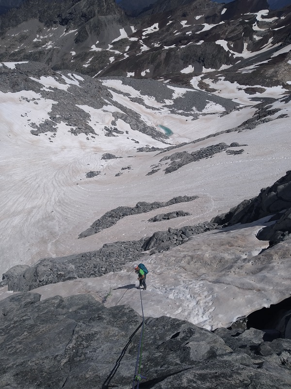 El retroceso del glaciar Pays Baché ha hecho que la habitual ruta normal haya quedado en muy malas condiciones, con terreno descompuesto y roca pulida. De hecho vimos una cordada retirarse, con muy buen criterio a nuestro parecer.
