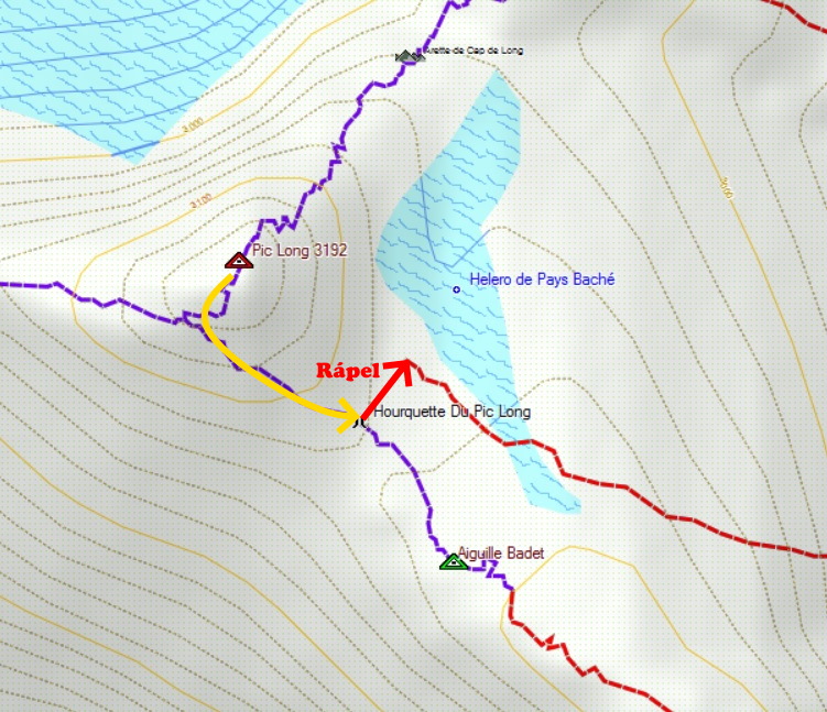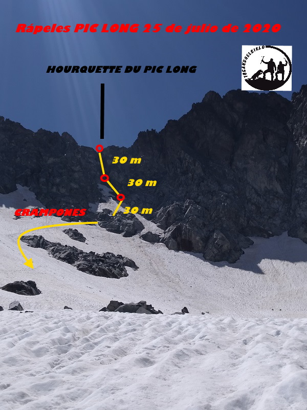 - Rapelar la antigua ruta normal desde la Hourquette du Pic Long. Requerirá dos cuerdas de 30 m o una de 60 m. Y el número de rápeles irá en función de la altura de la nieve. Es la opción de esta entrada.