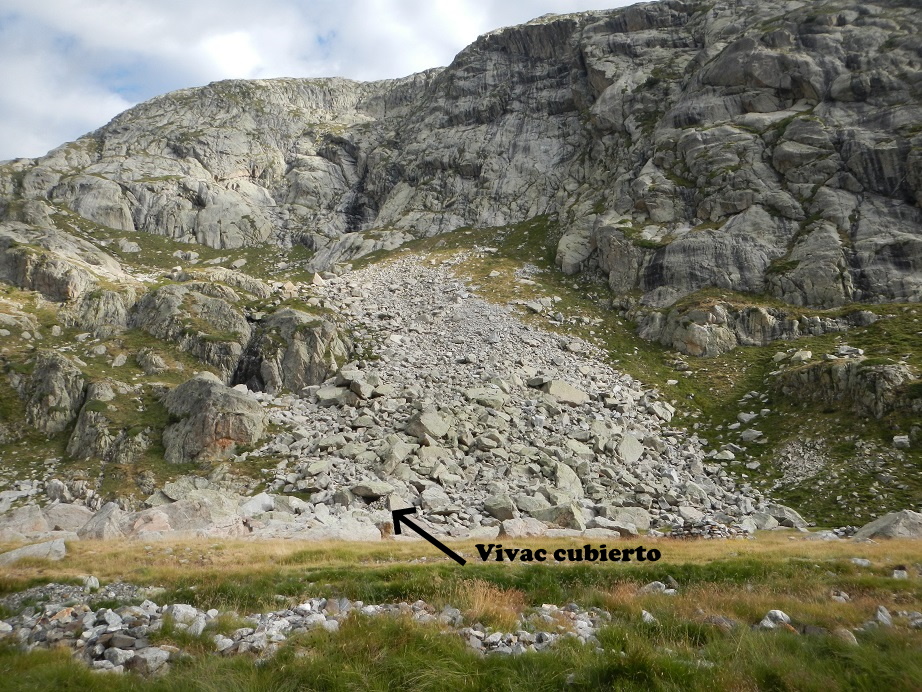 Continuamos ascendiendo el valle. Cruzamos un torrente que desciende desde el norte y llegamos a una zona plana donde encontramos un vivac cubierto.