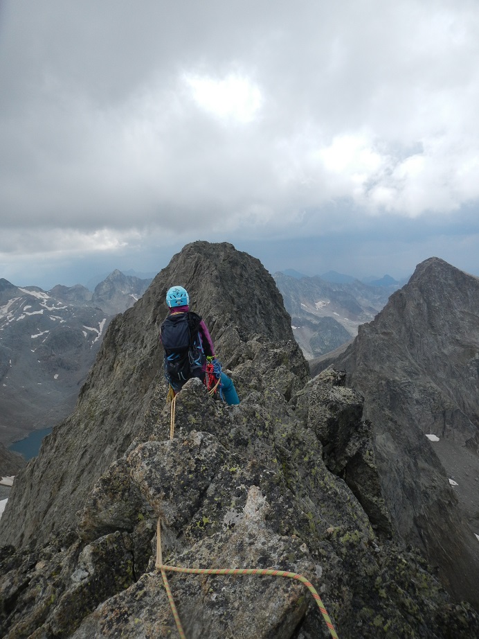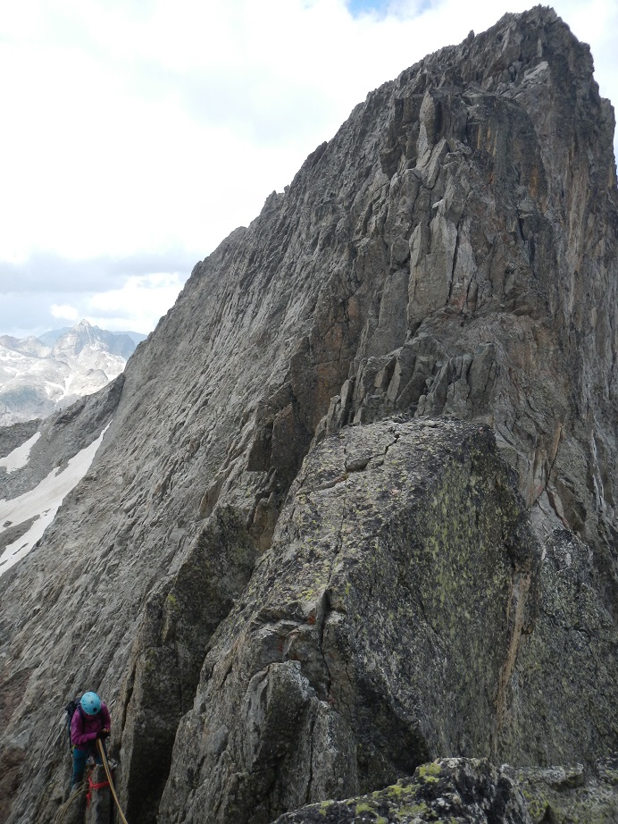 Una de las mejores crestas que hemos recorrido hasta la fecha, junto con la Cresta Lezat. Las mayores dificultades se concentran en los pasos previos y posteriores a la Aguja Jean Garnier, IIIº+. Siendo el resto más fácil pero muy aéreo.