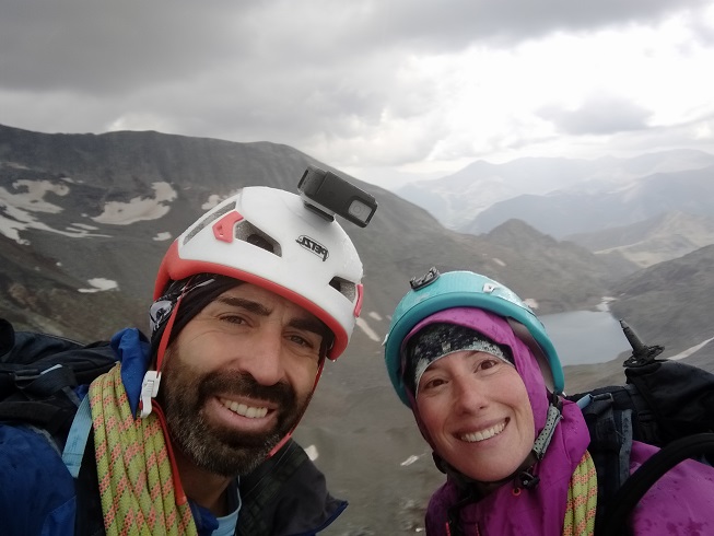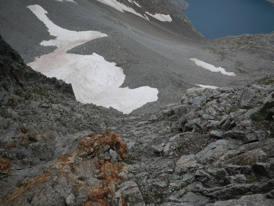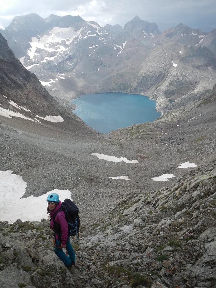 Destrepamos de la aguja hasta un pequeña brecha en la vertiente de Literola. Aquí encontramos una pareja de franceses que no pueden continuar porque uno de sus miembros se ha hecho daño en un tobillo. Les ofrecemos ayuda y nos indican que han llamado a la Gendarmería y que no necesitan nada, así que continuamos ya que el tiempo va empeorando por momentos.