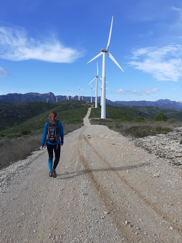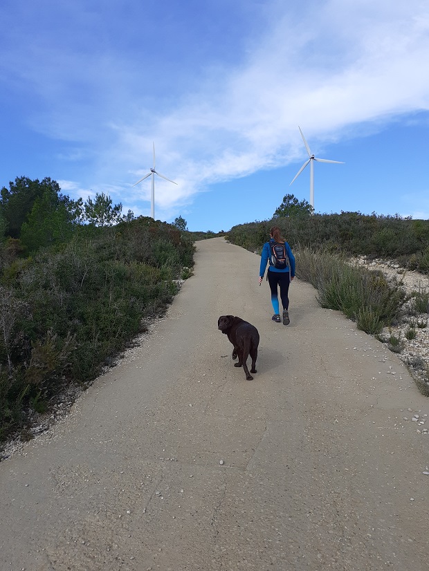 Que nos lleva de nuevo al parque eólico. Lo cruzamos y continuamos por la pista asfaltada hasta la avenida dels Xiprers.