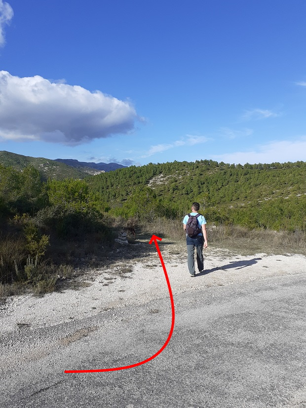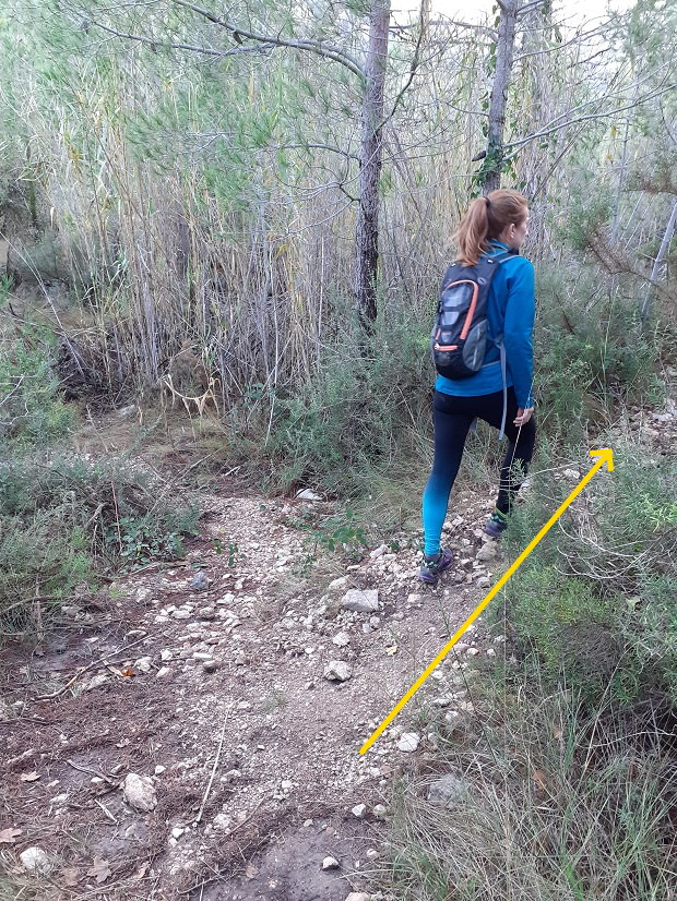 Y retomamos el sendero en descenso hasta el parking de las pinturas. Aquí seguimos un pequeño tramo de pista de tierra, pero estaremos atentos al desvío a nuestra derecha para cruzar de nuevo el barranco señalizado.