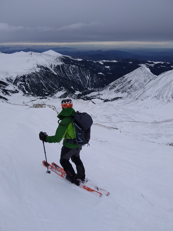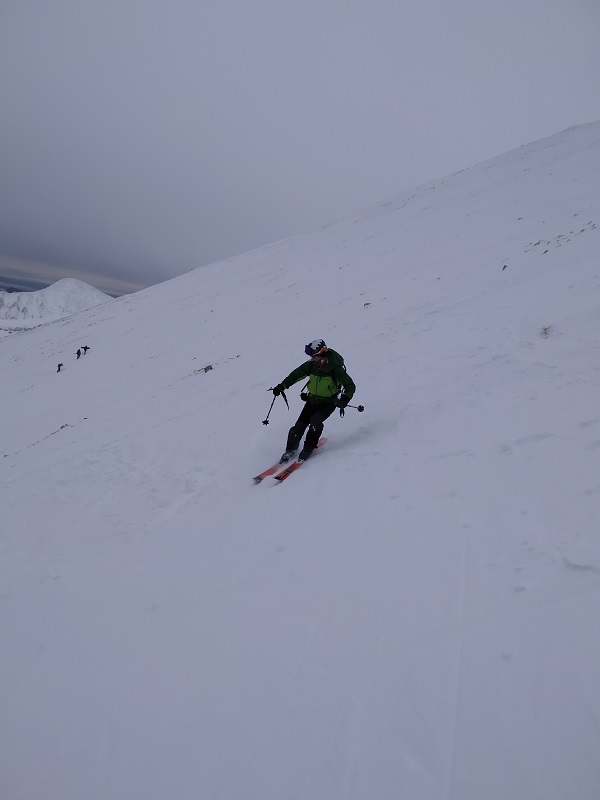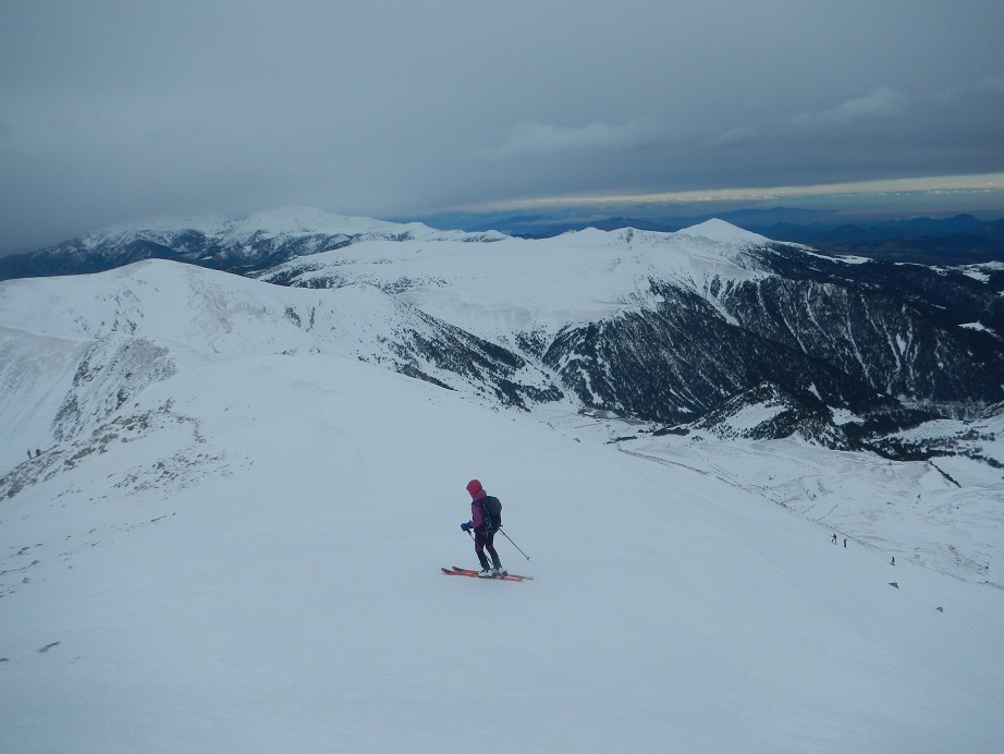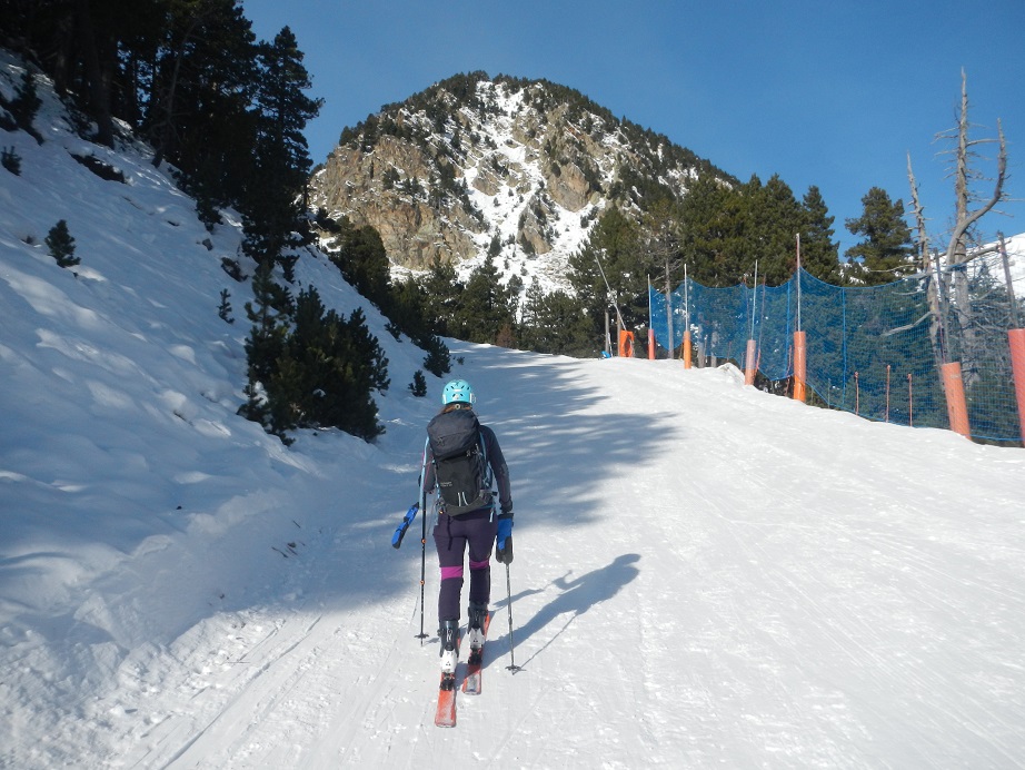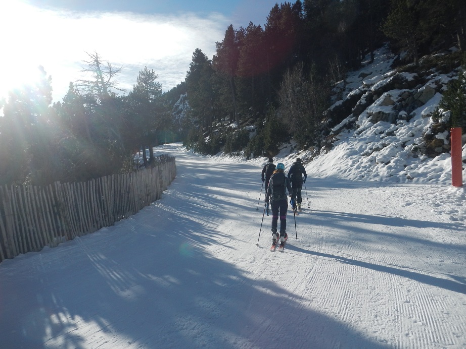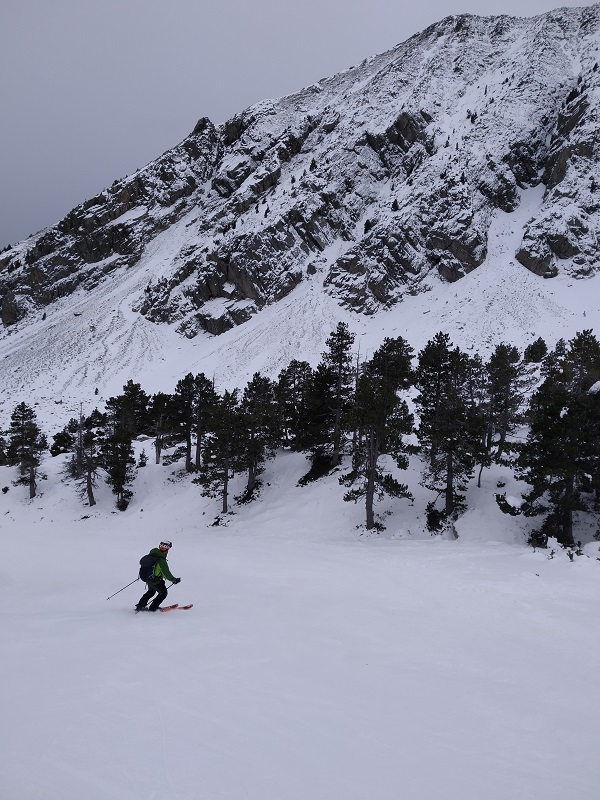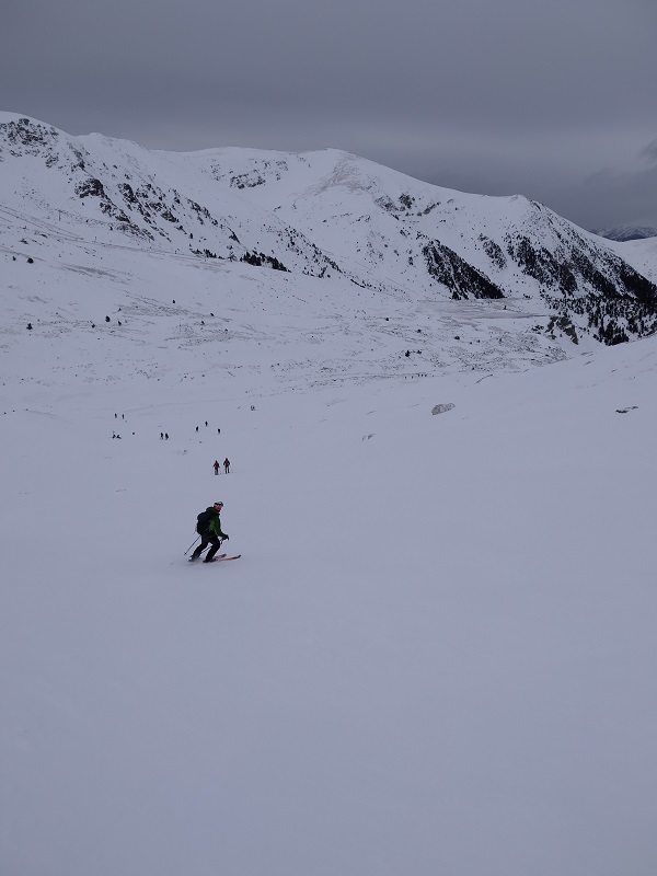 Con cuidado deslizamos el tramo más inclinado del collado y solo queda continuar en dirección a las pistas de esquí.