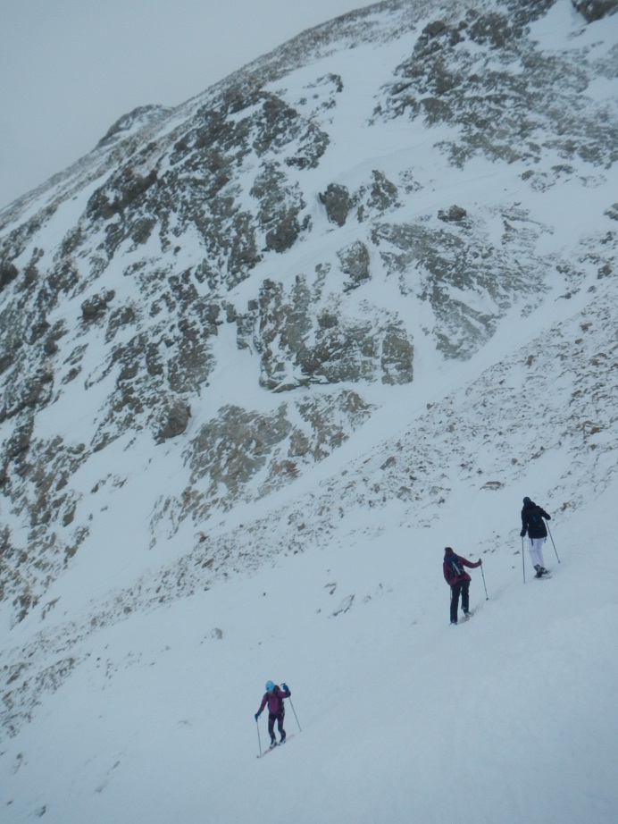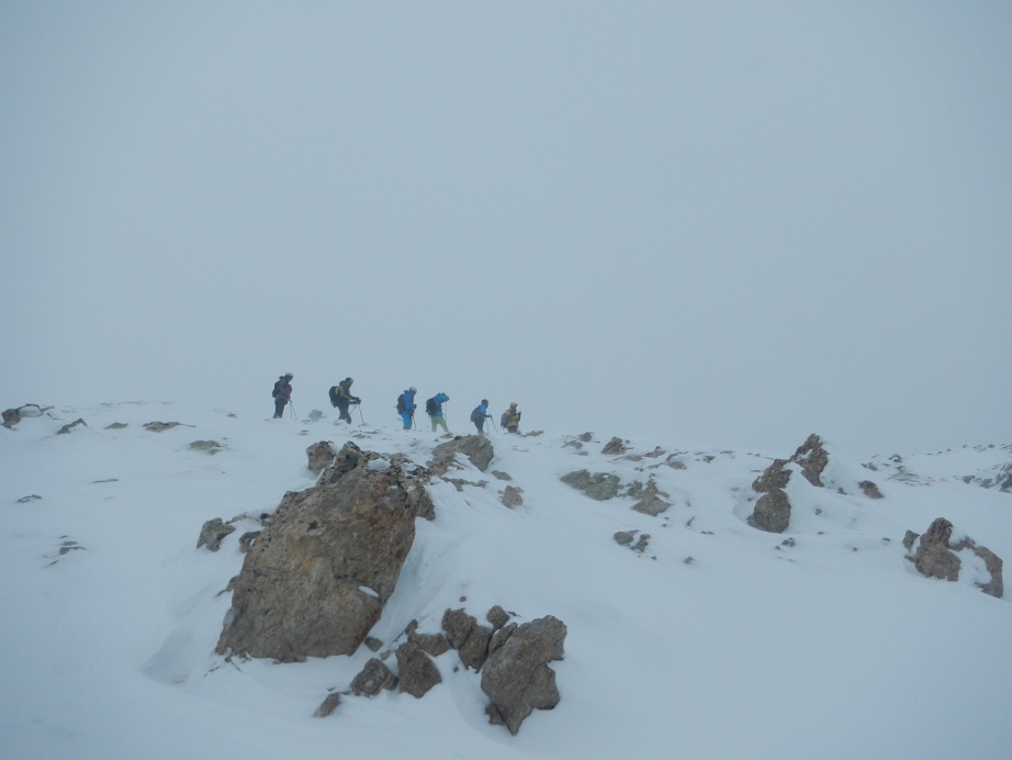 En esta zona el viento ha barrido mucha nieve, pero no es una zona especialmente rocosa, por lo que se puede continuar con los esquís.