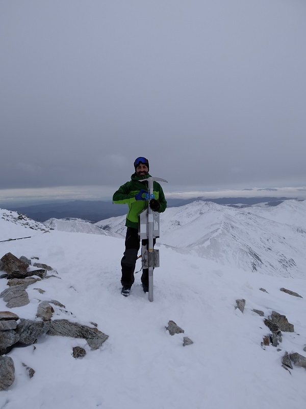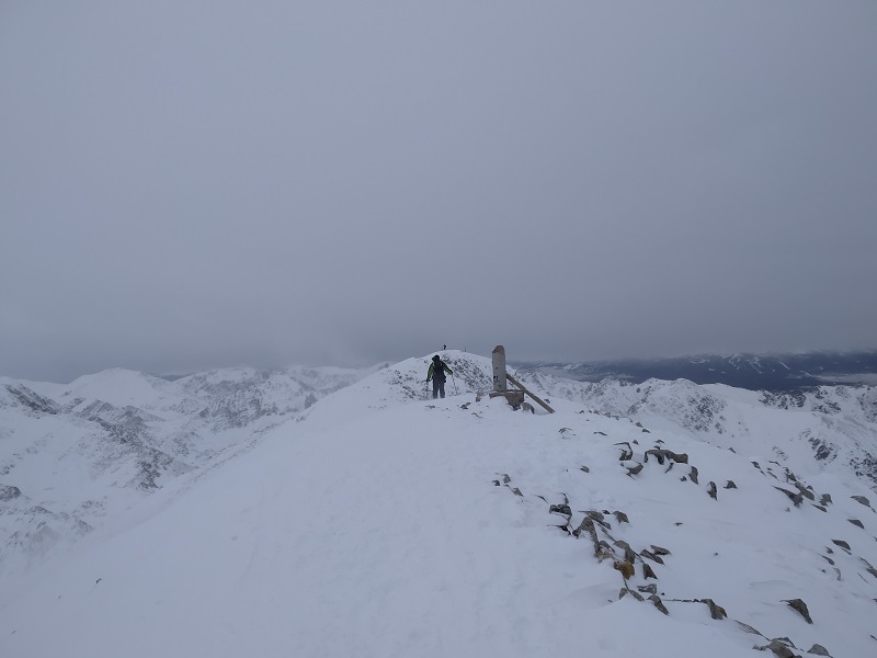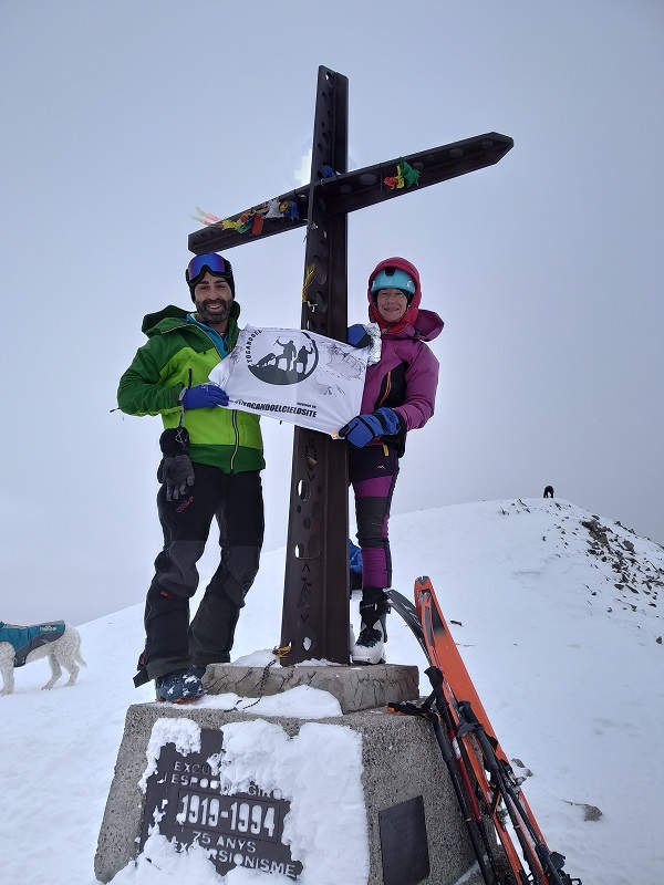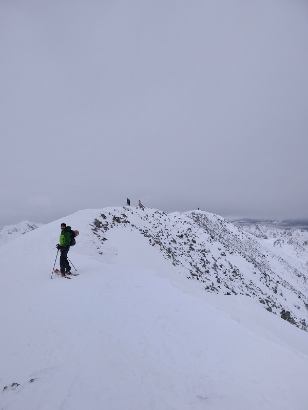 Pero nos permite llegar a la cumbre. Primero encontramos una gran cruz, que nos marca la antecima. Para coronar la cumbre debemos continuar unos metros más por una arista fácil, que encontramos en buenas condiciones para continuar incluso con los esquís.