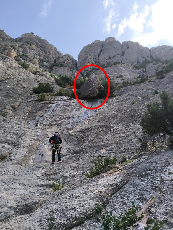 Ascendemos rectos dejando a la izquierda un gran bloque. Dejamos otro bloque más pequeño a nuestra derecha y luego hay que cruzar una pequeña canal para llegar a la reunión.