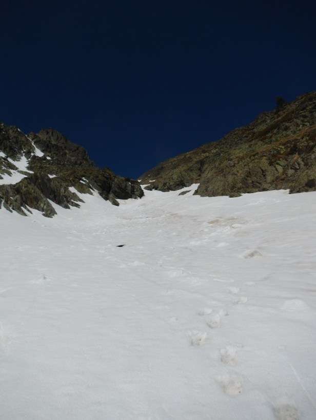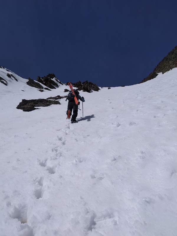 DIFICULTAD ESQUÍ: Difícil, por el descenso del corredor, pendiente 40º máximo con algún tramo estrecho.