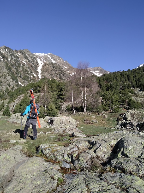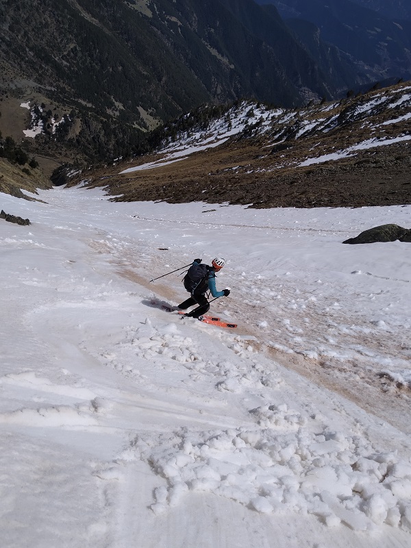 Apuramos lo que podemos, para descalzar en las inmediaciones del Pla de l’Estany, entorno a los 2.000 metros. En total, 900 m de desnivel esquiado. Ha valido la pena el porteo!