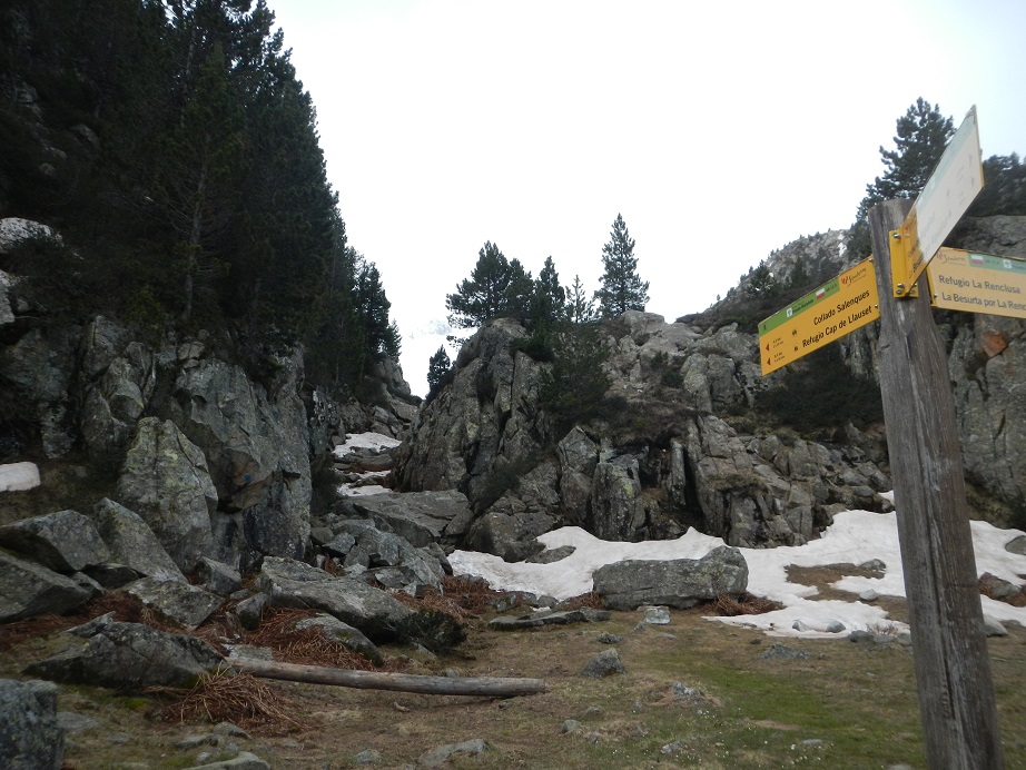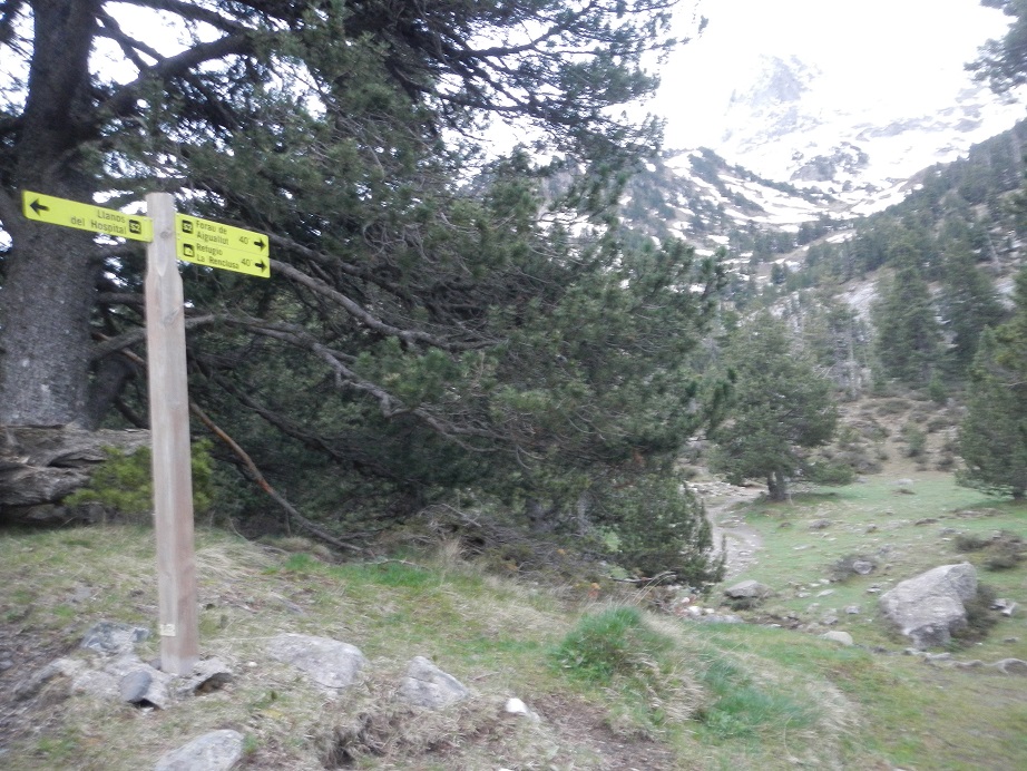 Llegamos a una bifurcación donde encontramos un cartel indicador. Dejamos el concurrido sendero que lleva la Renclusa y nos desviamos a nuestra izquierda en dirección a Aigualluts.