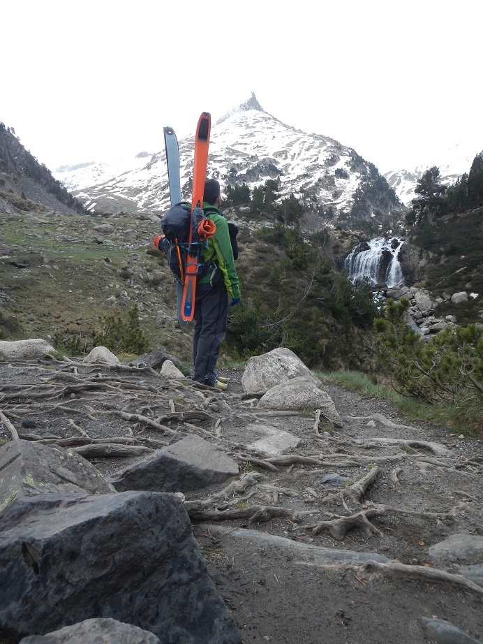 Elegimos la opción de ascender y descender por Aigualluts. Esto puede incrementar un poco el tiempo de porteo, pero hace que no tengamos que descalzar esquís en el paso del Portillón y es una ruta mucho más solitaria.