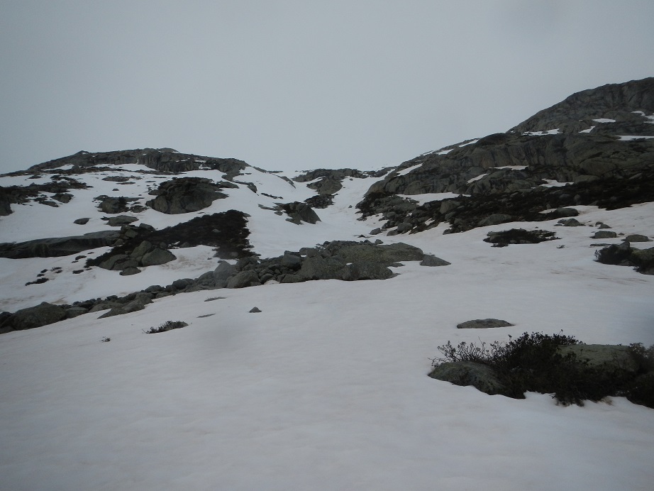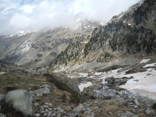 La niebla aparece en algunos momentos y hace difícil orientarse. Debemos avanzar en dirección norte o noroeste para llegar al Glaciar del Aneto y después en dirección oeste bajo el pico Coronas hacia el collado del mismo nombre.