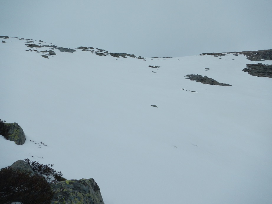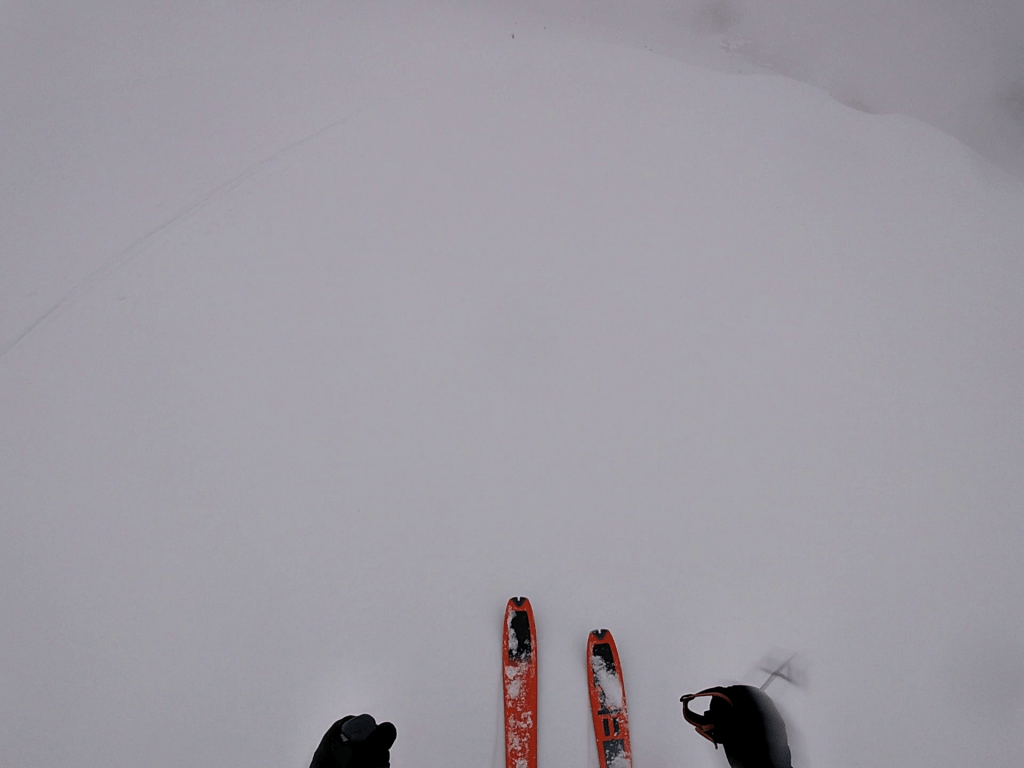 Sigue sin haber nada de visibilidad. Calzamos esquís con la idea de ir descendiendo poco a poco, siguiendo la huella de subida. La pendiente es moderada, hasta llegar a la altura del collado de Coronas, donde se suaviza un poco.