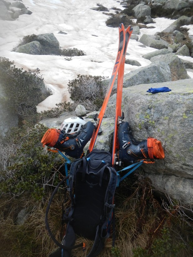 Descendemos la canal obligada del principio y descalzamos esquís en el mismo punto.