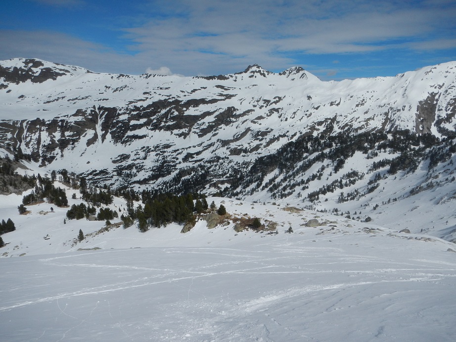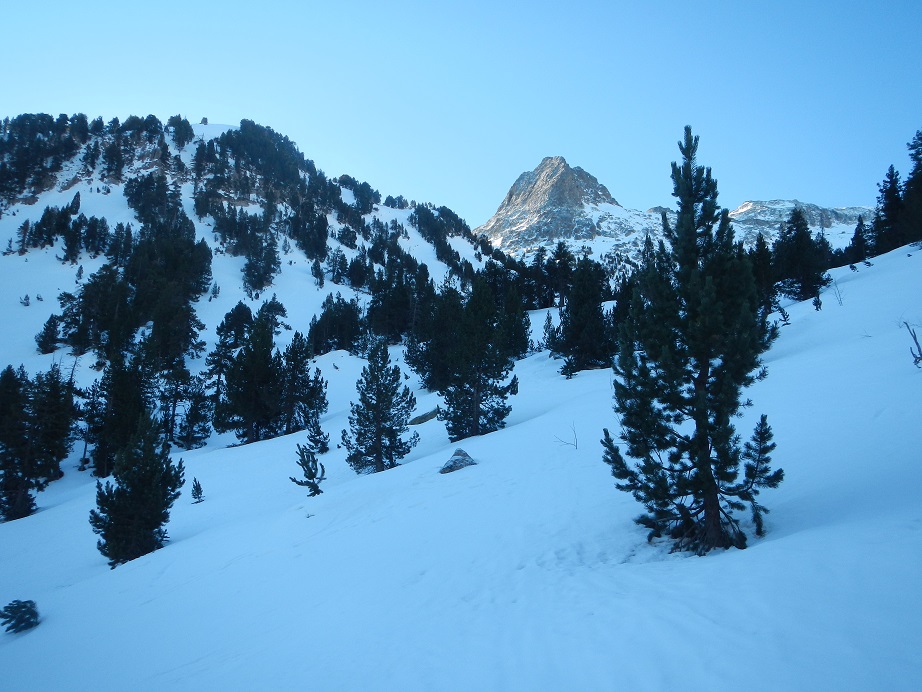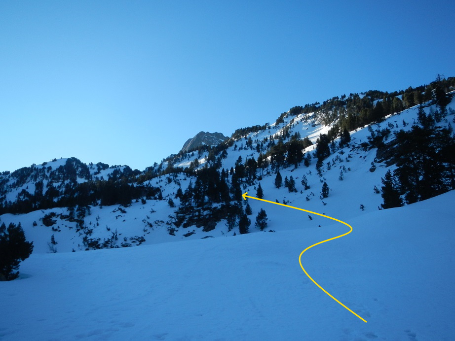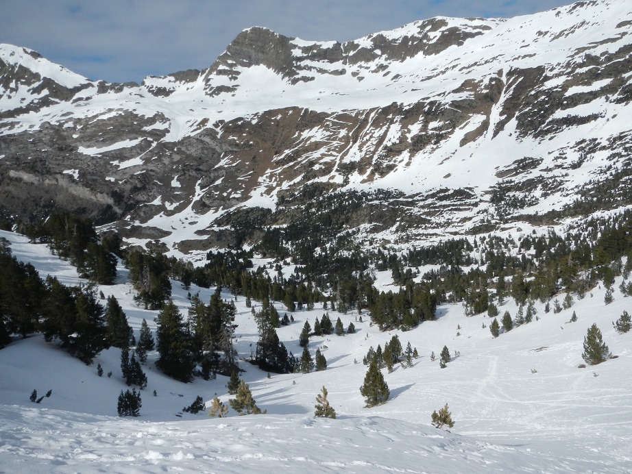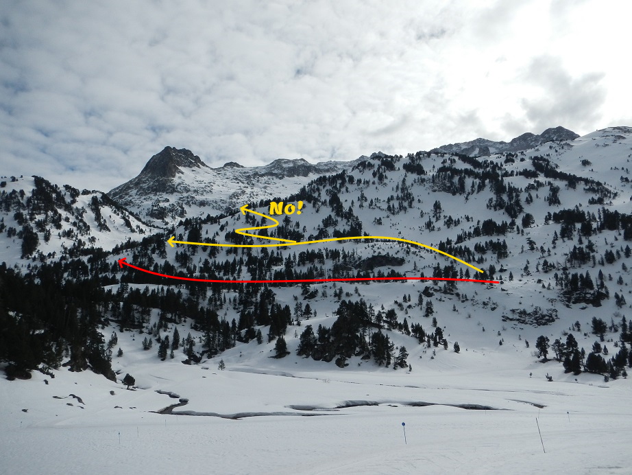 Esquiamos hacia la Besurta en busca de las pistas de esquí de fondo, pero podríamos ir más hacia la izquierda buscando el mismo camino de ascenso, al gusto.