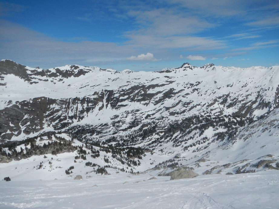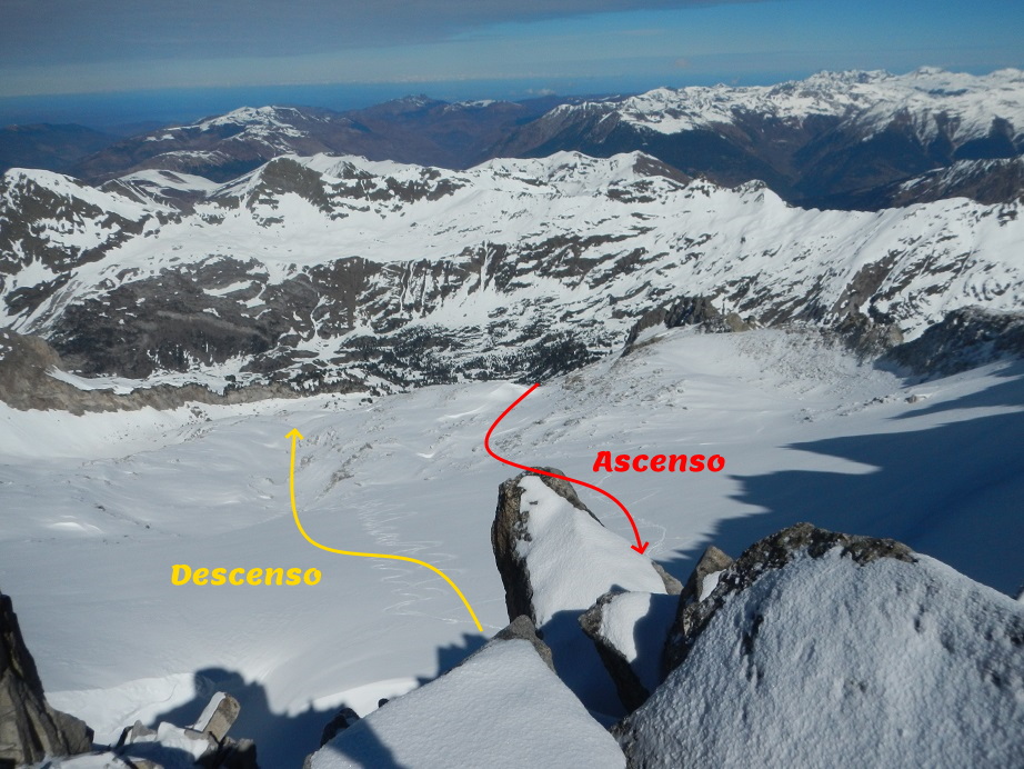 Echamos un vistazo al descenso con esquís, que no realizaremos por el mismo camino de ascenso, si no un poco más a la izquierda. Bien innivado podemos descender por donde queramos.