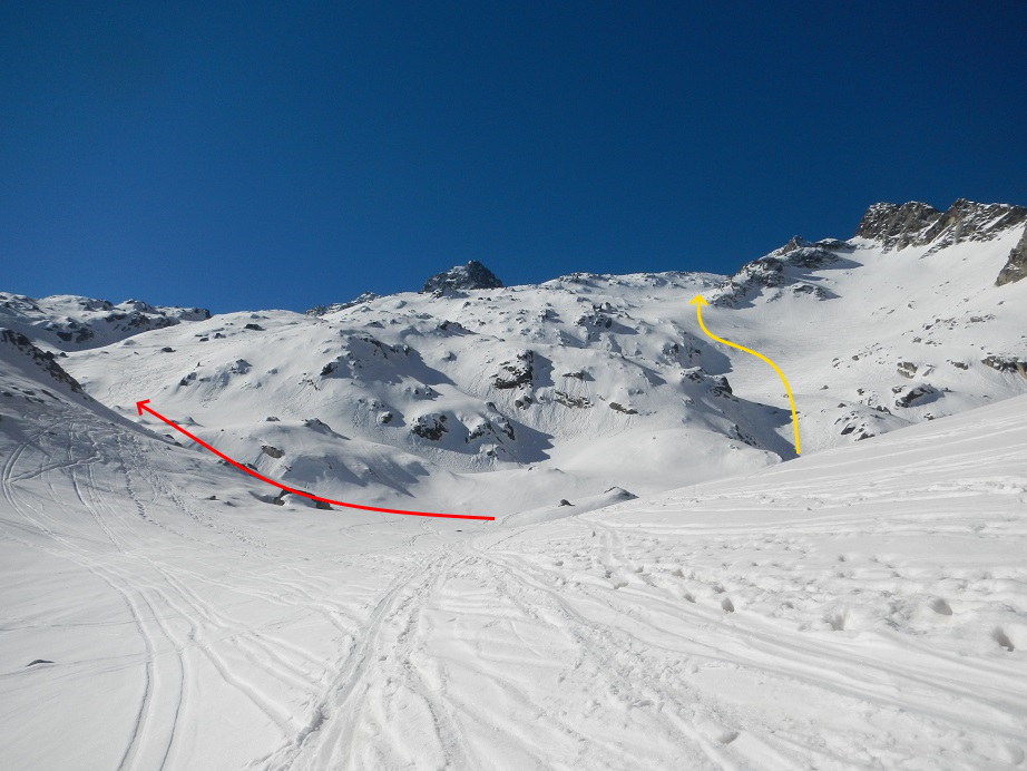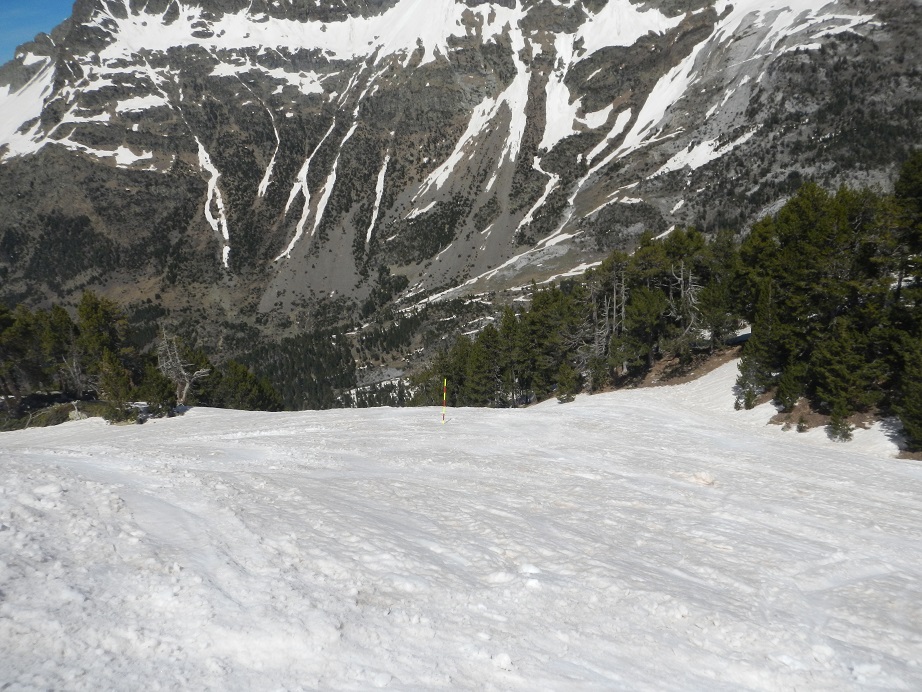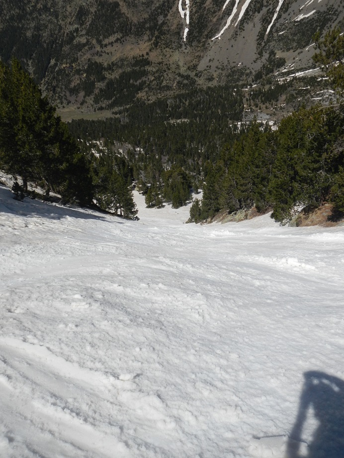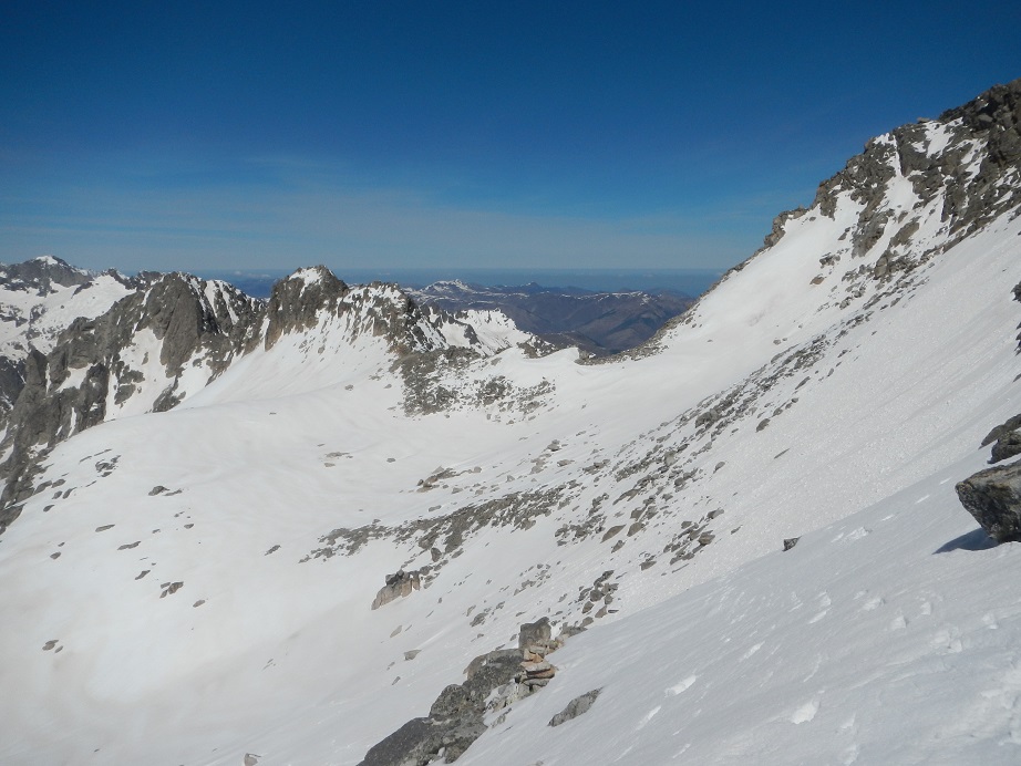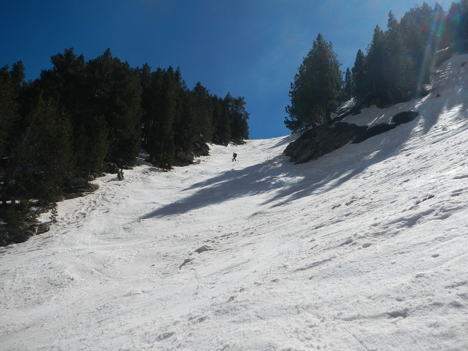 La pendiente es moderada, excepto al final que aumenta un poco. En todo caso no supera los 35º-40º. Cuando llegamos al collado podemos ver la vertiente sur. Debemos localizar el collado del Cordier, poco definido. No ir en busca de un marcado collado que queda muy abajo.
