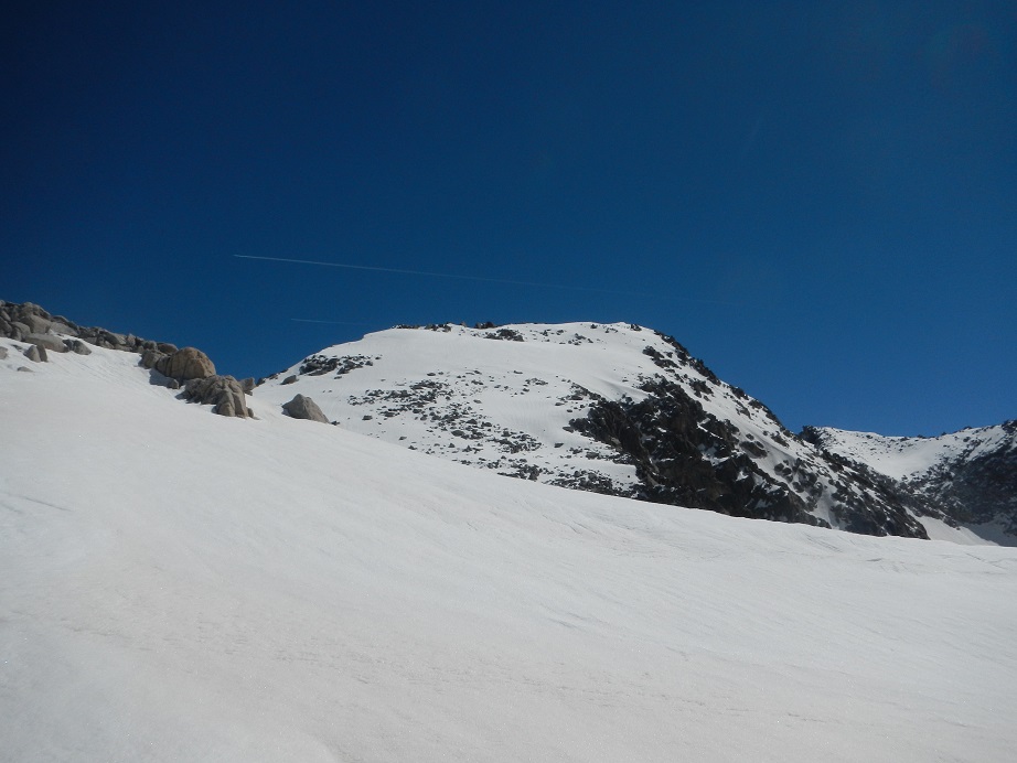 Aquí volvemos a calzar esquís. Perdemos un poco de altura y comenzamos el asalto final a la cumbre, solo nos quedan 130 metros de desnivel.