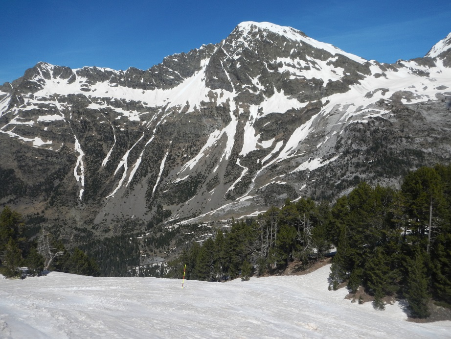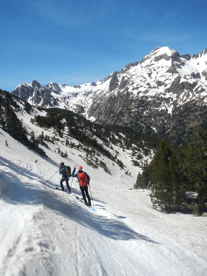 Lo realizamos por el mismo camino. Podemos calzar esquís en la misma cumbre, descendiendo con cuidado al principio en dirección al collado del Cordier.