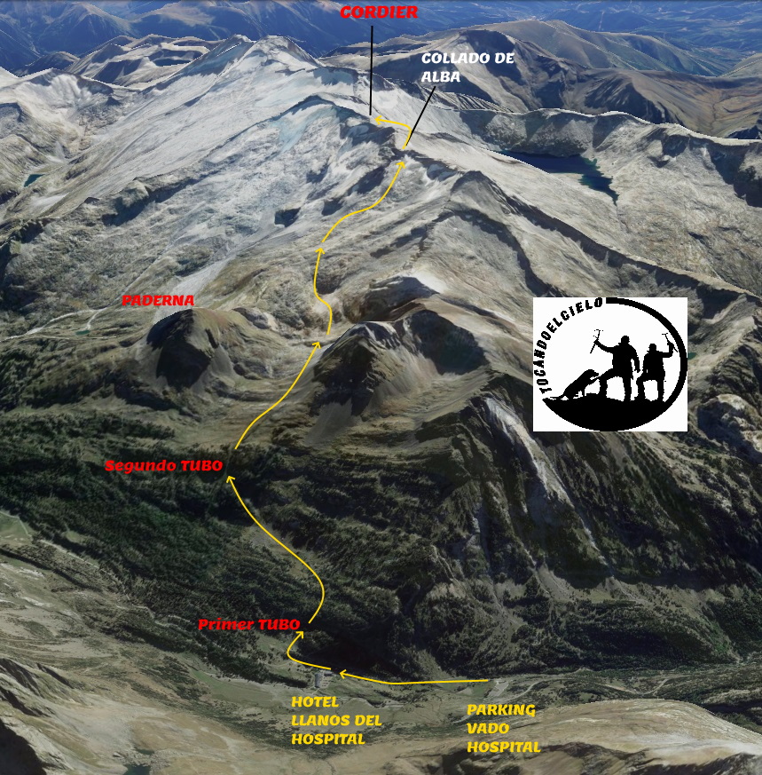 - DIFICULTAD ALPINA: F+. La zona de mayor pendiente es un corto tramo del final del corredor que da acceso al collado de Alba, 35º-40º. Después tenemos una travesía al collado Cordier con nieve muy dura y un poco expuesta por la presencia de rocas, precaución