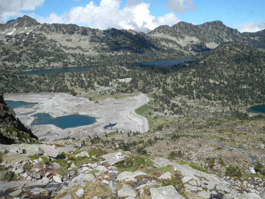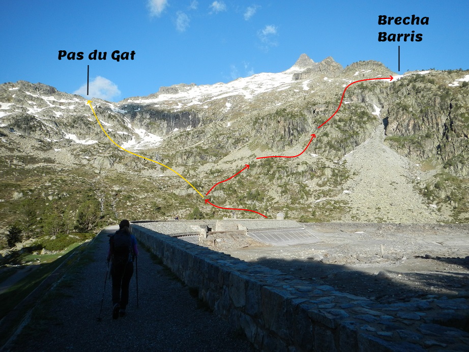 A la izquierda del embalse está la zona de vivac. De frente vemos el camino hacia la Brecha Barris y el Pas du Gat que nos llevaría al Embalse de Cap de Long.
