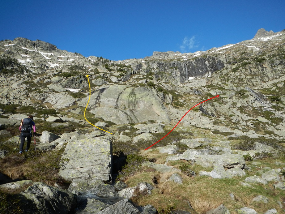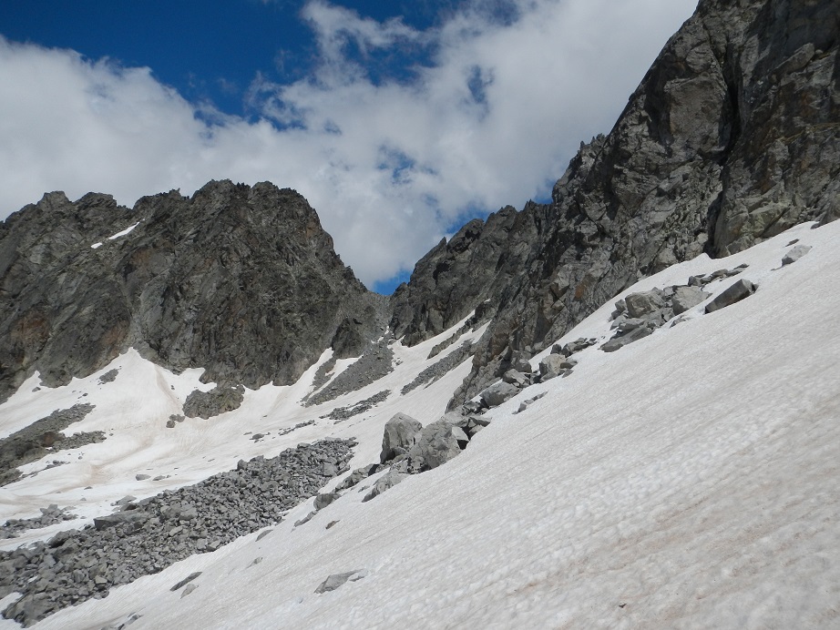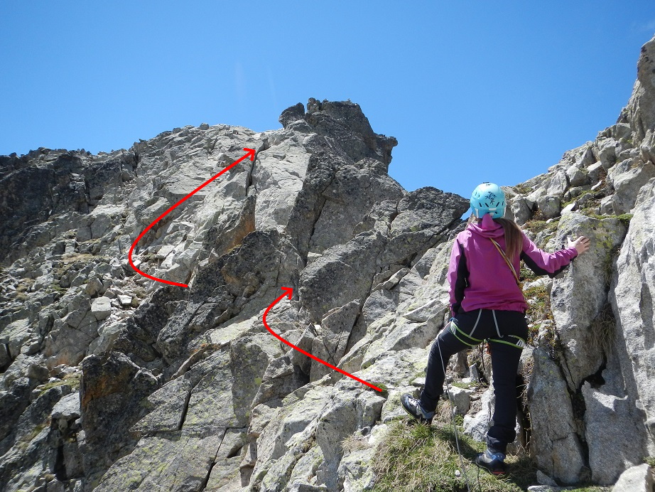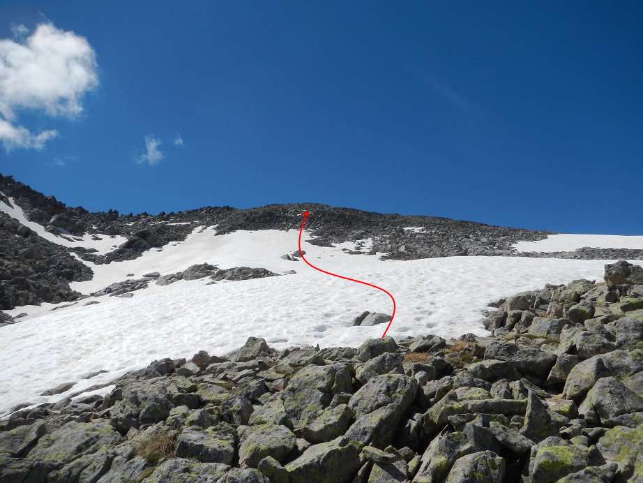 En lugar de ascender de frente por una canal con huella de esquí, ascendemos a la derecha por una pala de nieve poco inclinada, hasta llegar a una zona de bloques. Cuando acaba la nieve giramos a la izquierda por una vira de bloques fácil y luego giramos a la derecha buscando el camino más evidente y apoyando las manos en algunos puntos.