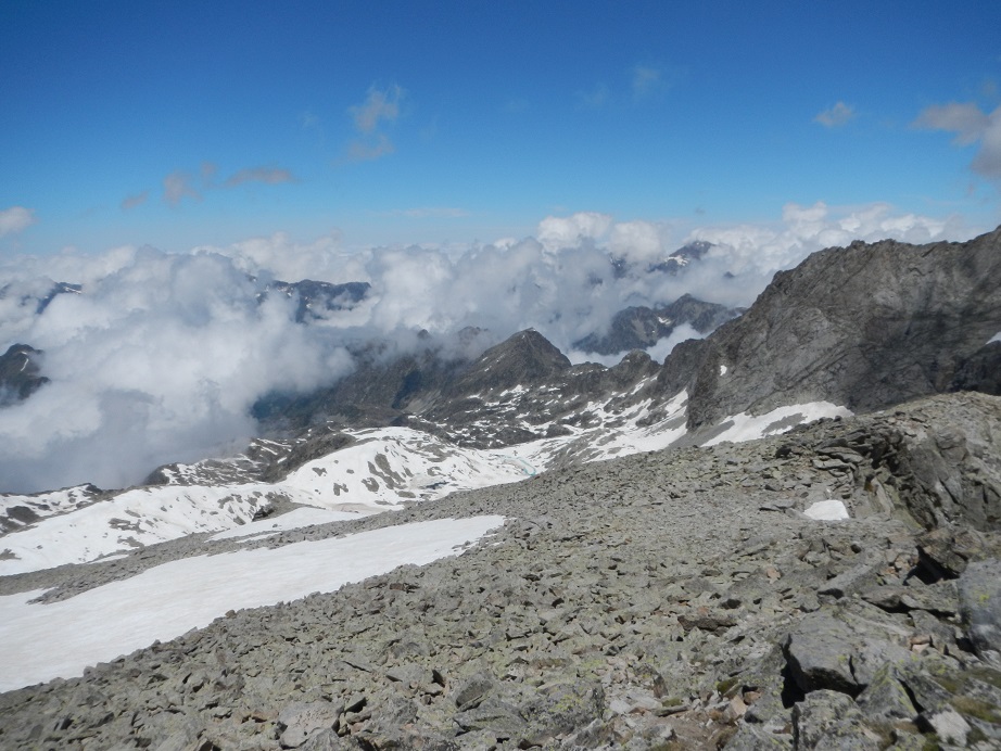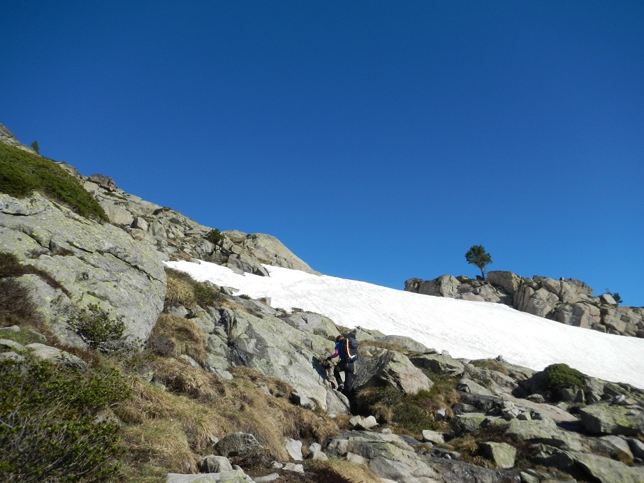 Ahora debemos volver a la cumbre del Turón de Néouvielle. Por el mismo camino, intentamos ascender un trozo por el corredor y cuando aparece el nevero trepamos a la izquierda para enlazar con el camino de bajada.