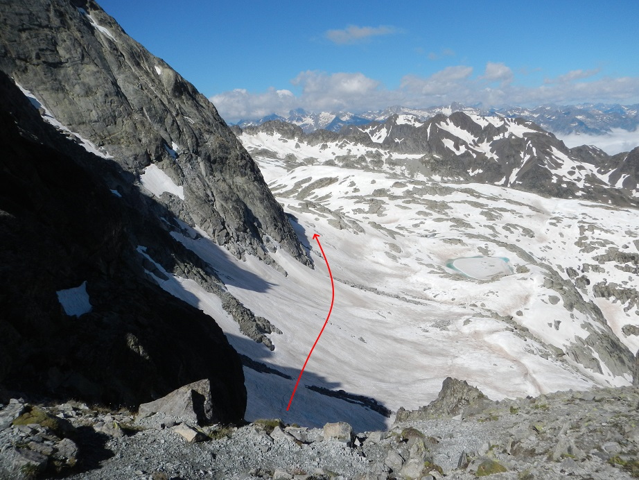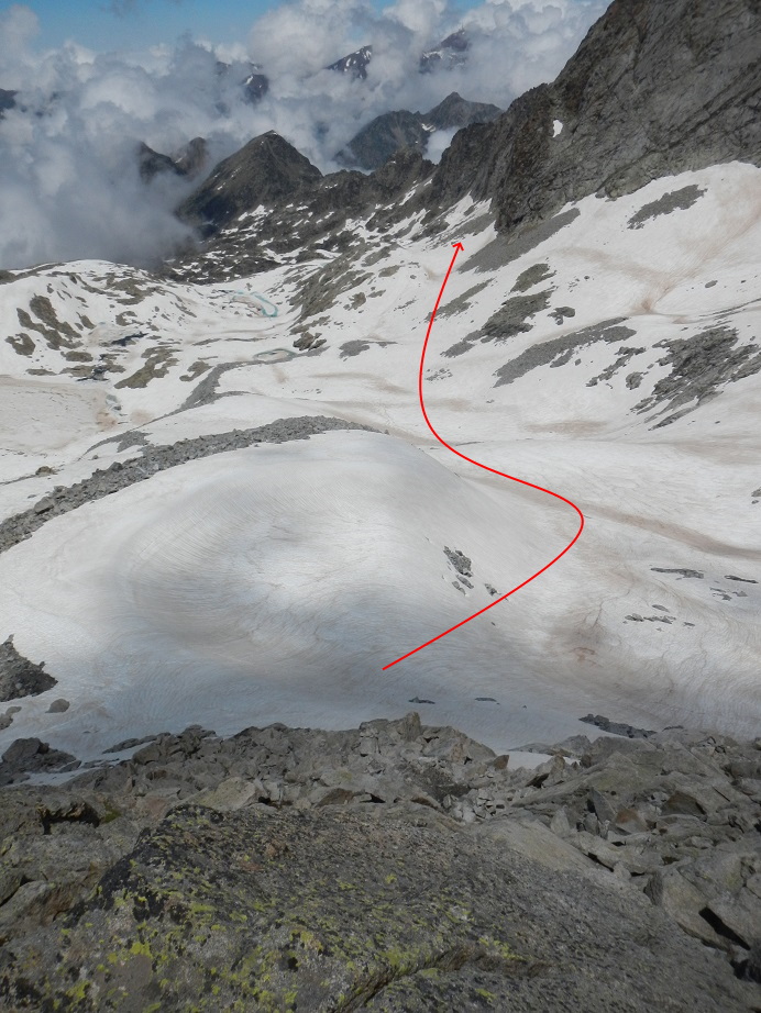 - Descender un corredor que baja directo a la izquierda. Lo descartamos porque hay un pequeño nevero.