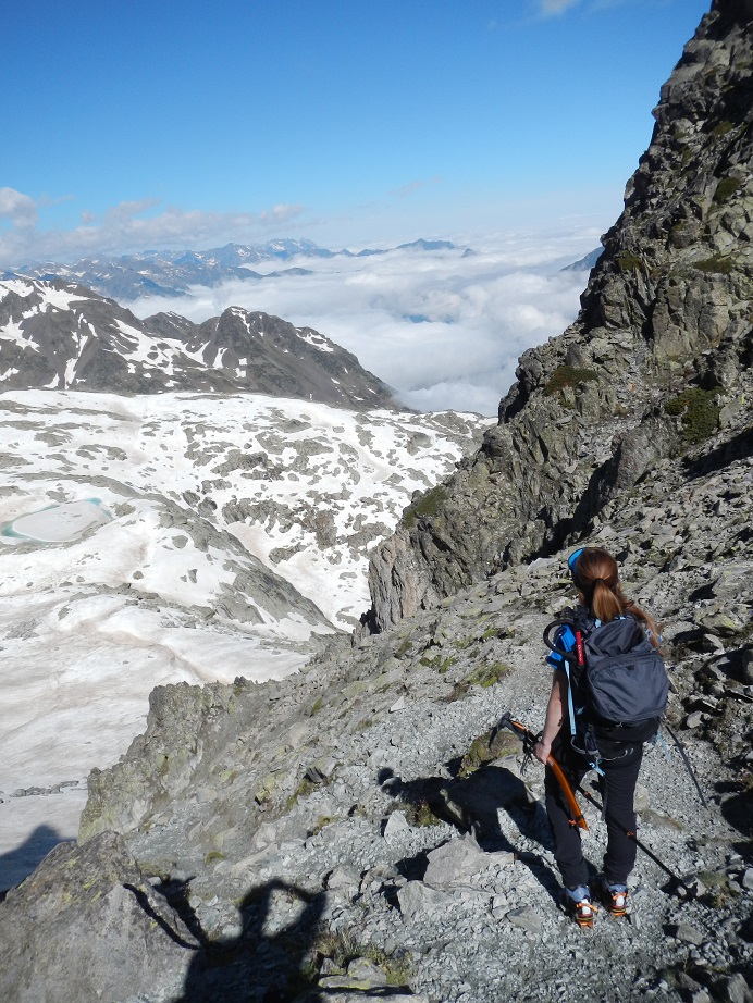 El Turón no es visible todavía. Unos franceses que han subido desde el refugio de la Glère nos comentan que hay poca nieve, así que decido esconder los esquís en la Brecha y continuar con crampones.