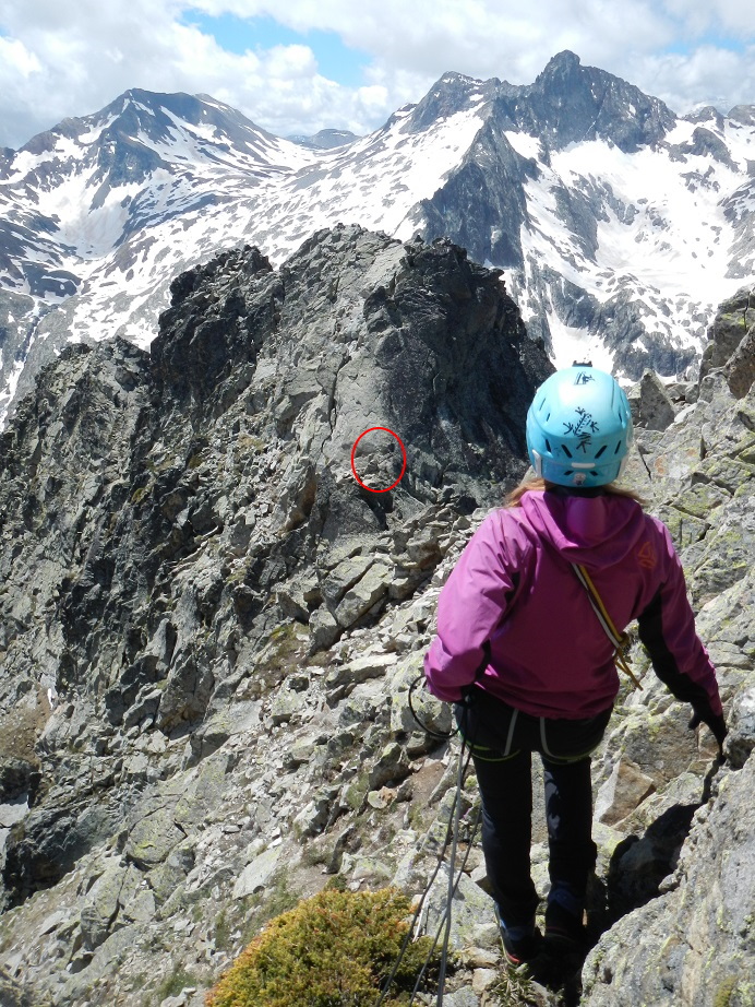 En principio seguimos la arista en descenso, un poco por la izquierda, hay un hito visible.