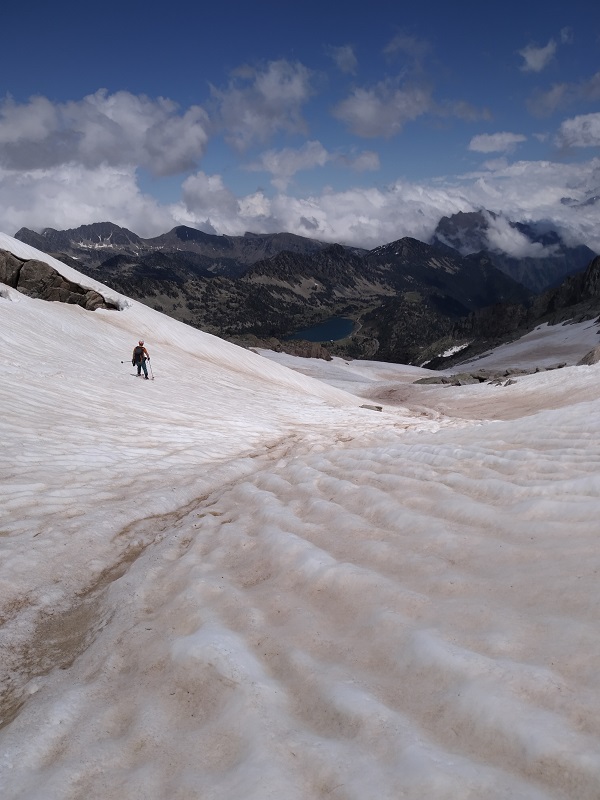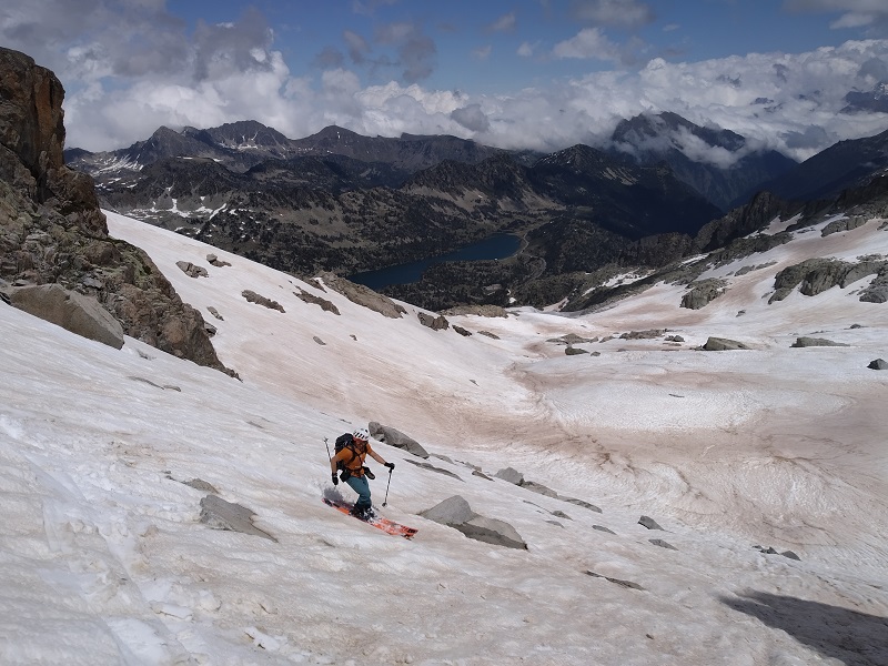 La zona suele ser ideal para acabar la temporada de esquí de montaña, ya que guarda nieve hasta bien entrado junio. Pero el calor anormal de esta primavera de 2022 ha hecho que las condiciones no sean tan buenas como otros años. Intentamos las ascensión con esquís pero los acabamos disfrutando menos de lo que nos hubiera gustado.