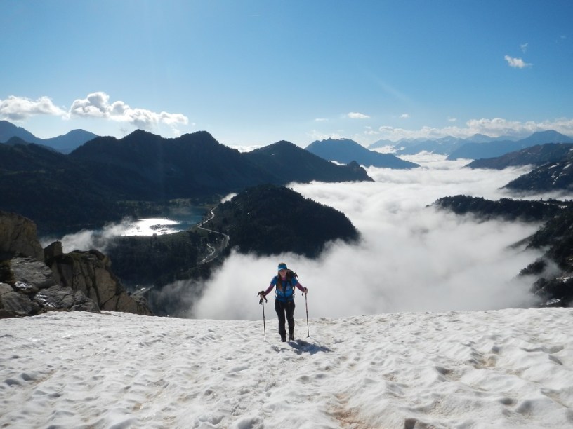 Ahora debemos volver a la cumbre del Turón de Néouvielle. Por el mismo camino, intentamos ascender un trozo por el corredor y cuando aparece el nevero trepamos a la izquierda para enlazar con el camino de bajada.