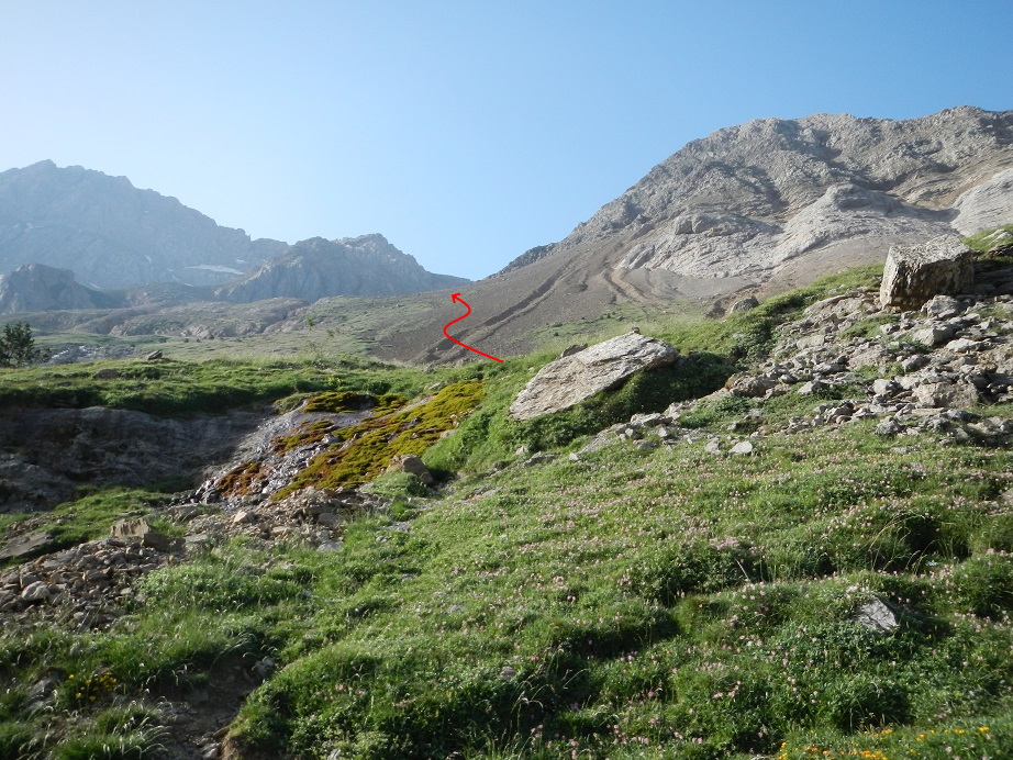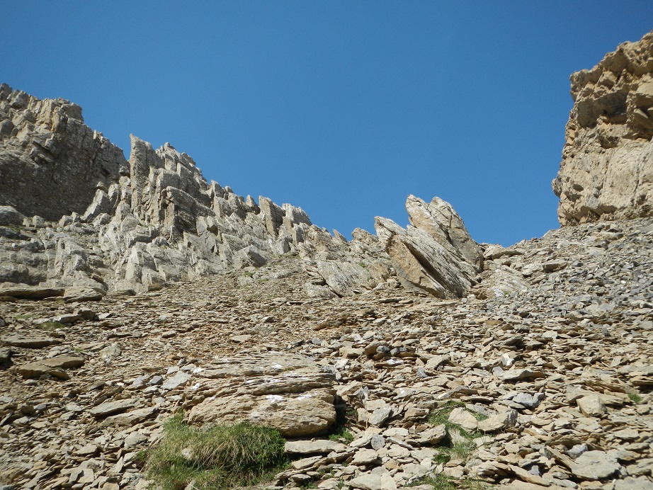 Dejamos la cabaña a nuestra izquierda y localizamos a la derecha una llamativa pedrera, que desde aquí parece muy inclinada y descompuesta.