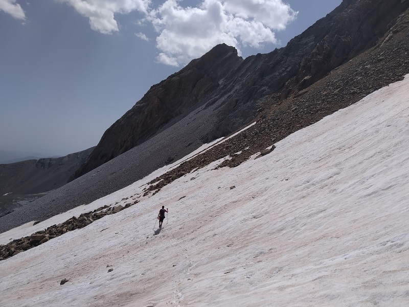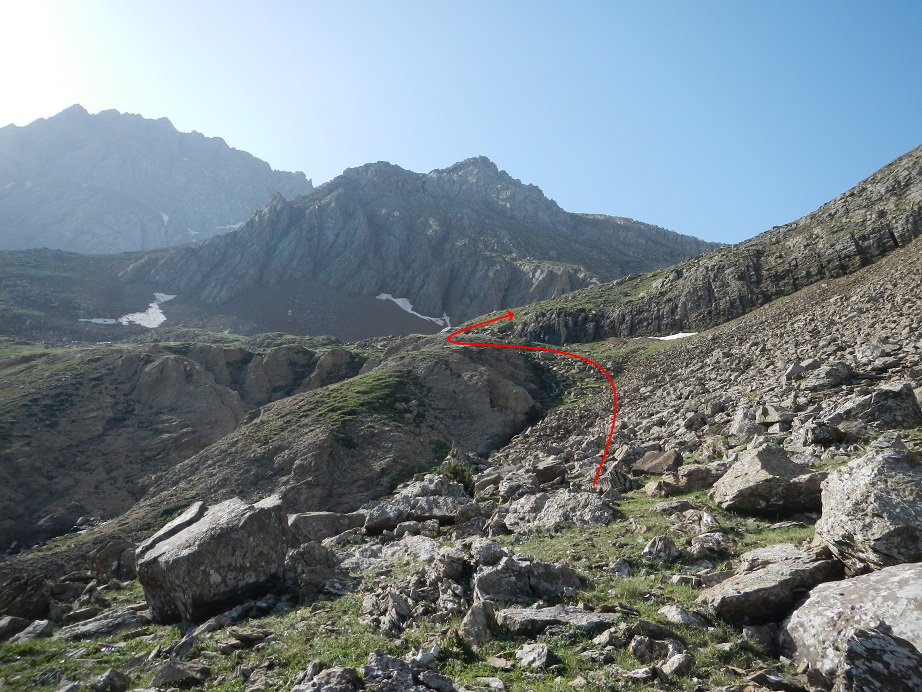 Esta opción nos obliga a superar un nevero un poco inclinado. Se puede evitar la zona más inclinada descendiendo unos metros más más hacia el sur. Ya tenemos a la vista el collado al que debemos llegar.
