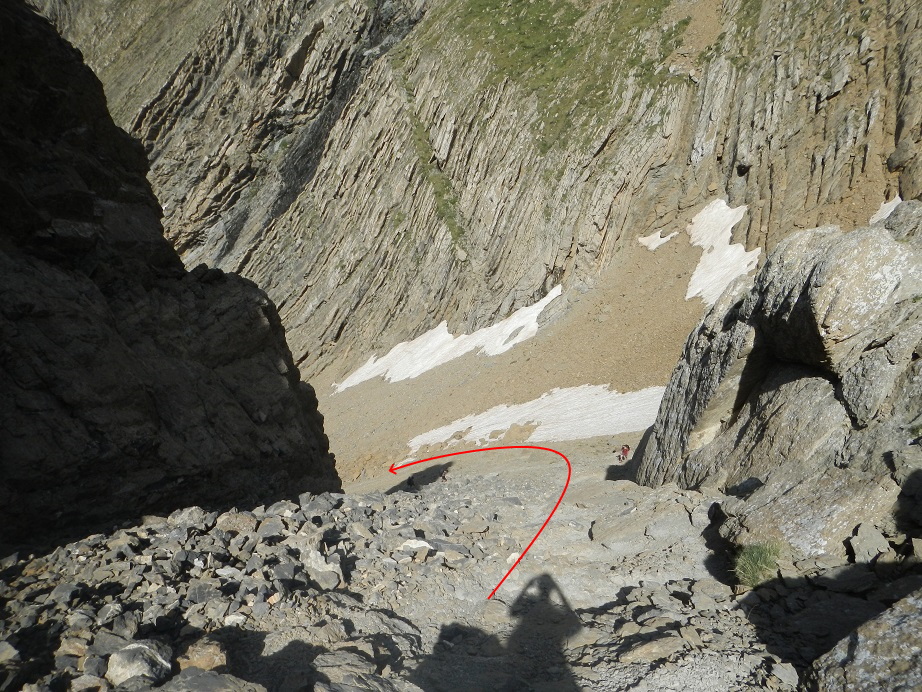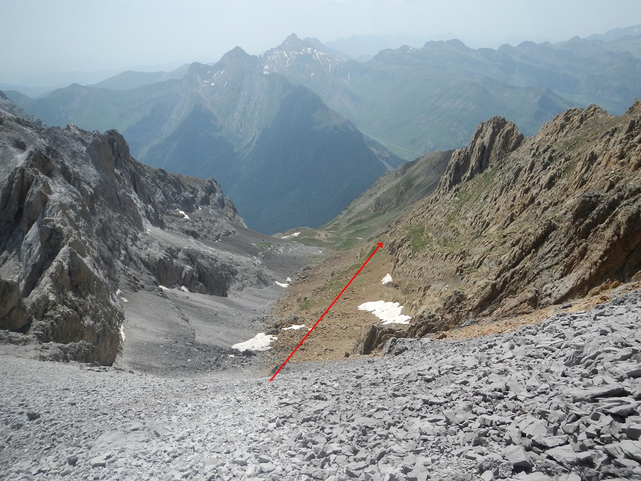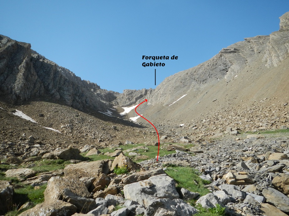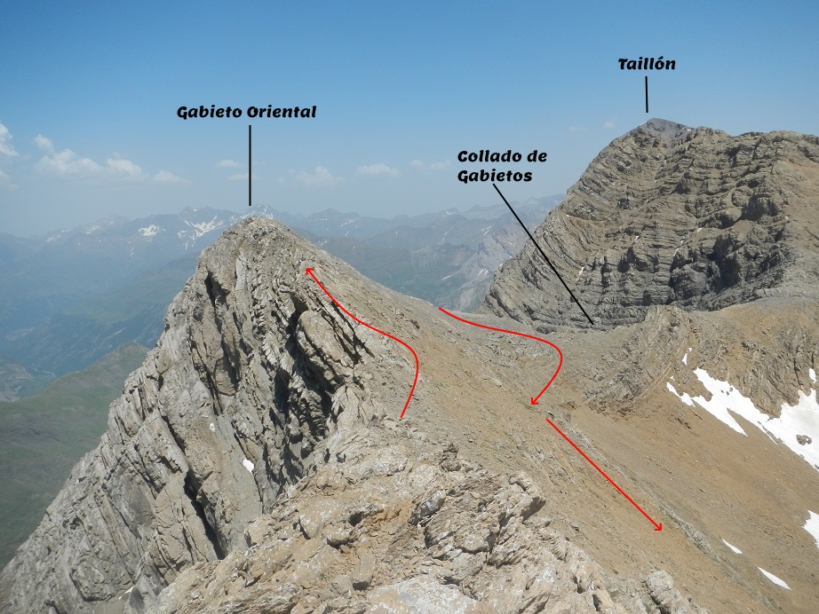 - Alcanzar el collado donde comienza la arista suroeste, que explicamos en esta entrada y descender hacia el este en busca del collado de Gabieto, F+.