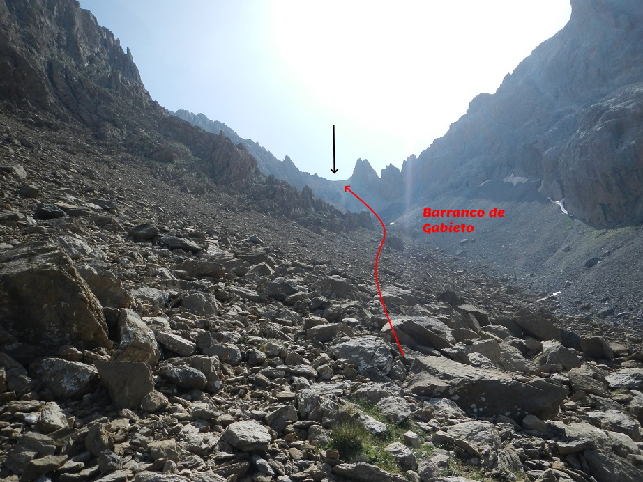 Llegamos al collado de roca gris. Ahora solo queda desandar el camino de ascenso. Entramos en el barranco de Gabieto. Vamos avanzando un poco más a la derecha, sin bajar al fondo del barranco.