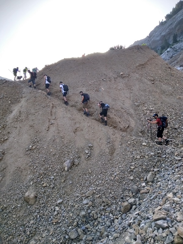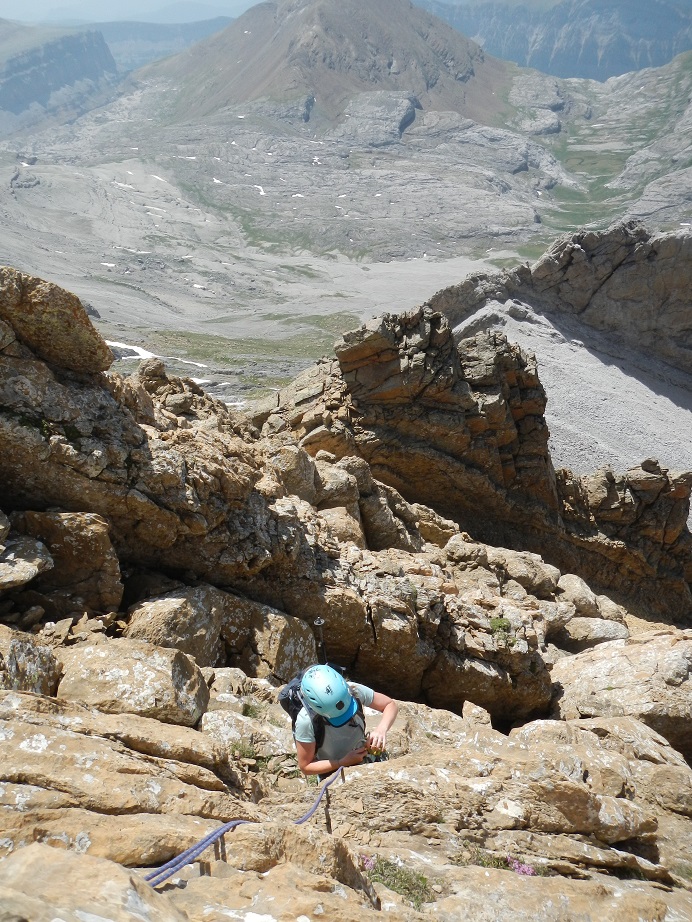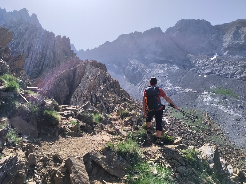 Caminando descendemos en busca del collado de Gabietos. Teóricamente, a la izquierda hay una ruta que nos lleva al Puerto de Bujaruelo. Esta opción sería más corta, pero con el retroceso de los glaciares no tenemos claro su estado, así que optamos por el camino seguro, aunque más largo, volver al collado de roca gris donde hemos comenzado la arista, dejando a nuestra derecha los picos de los Gabietos.