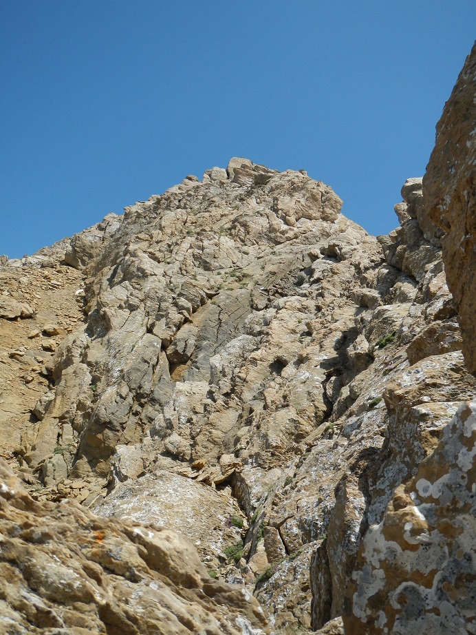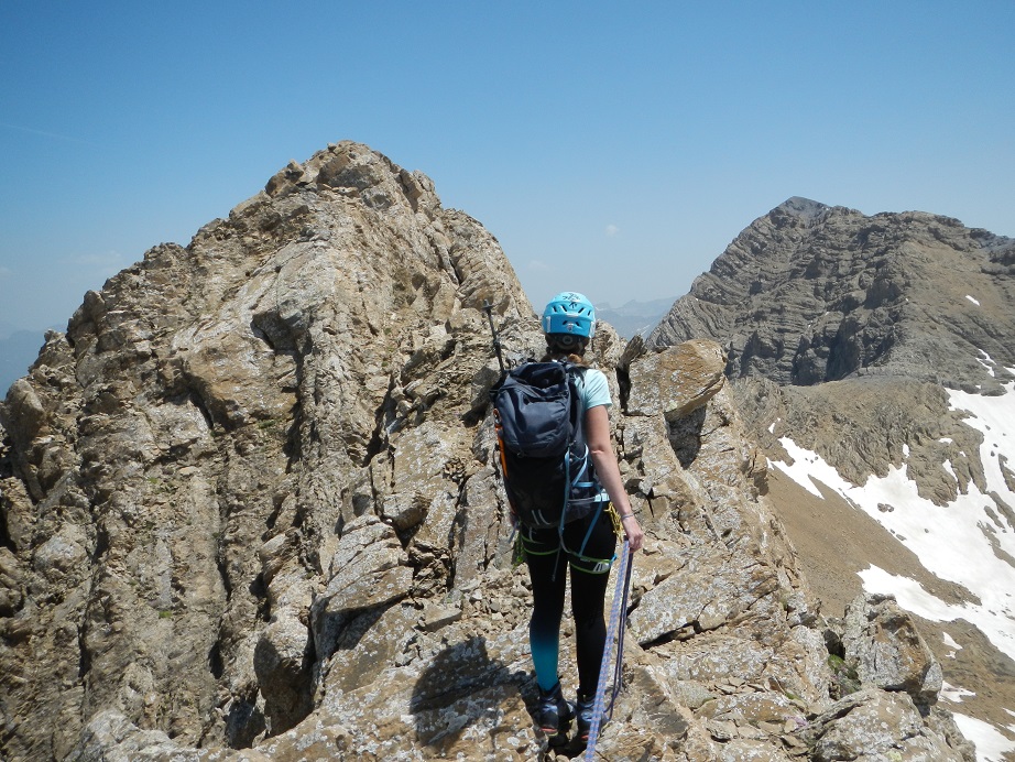 Solo queda un detrepe hasta una brecha y tras una última trepada llegamos ya por terreno sencillo a la primera cumbre del día.