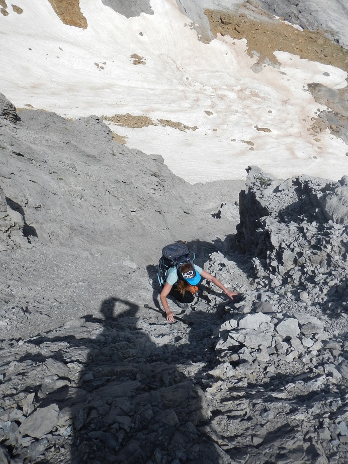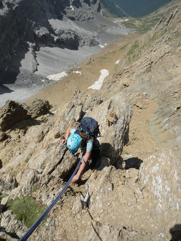 Comenzamos caminando por la veta gris y cuando la roca cambia de color, rodeamos el primer gendarme por la derecha, entrando en un pequeño corredor que nos deposita en el centro de la arista.