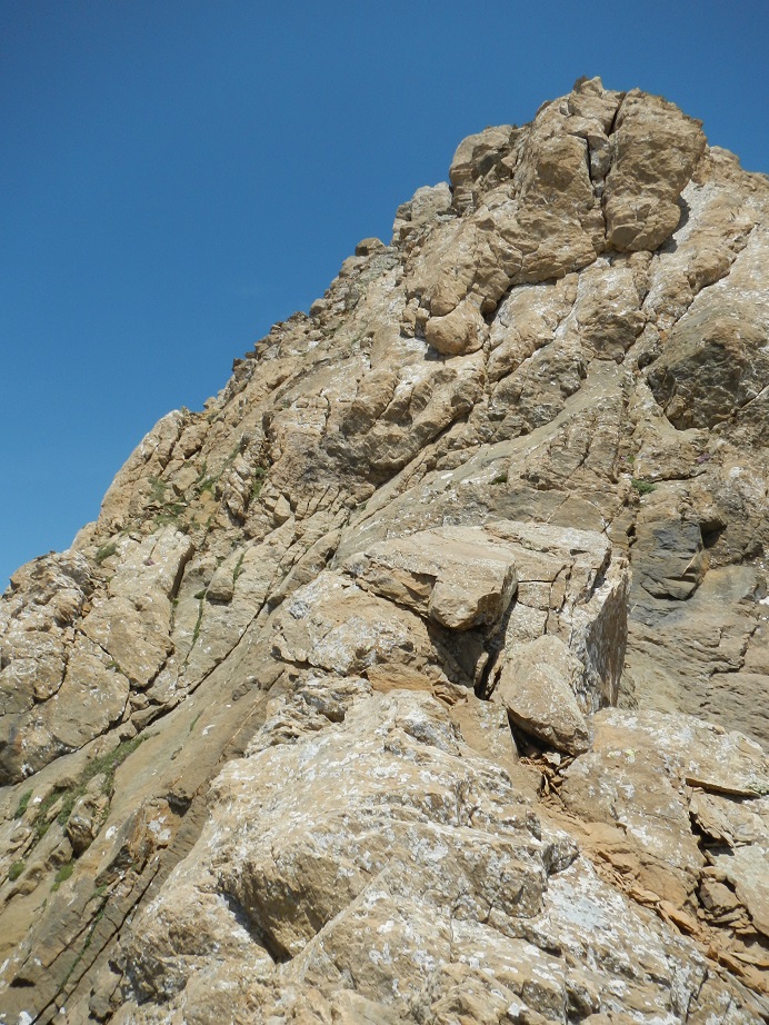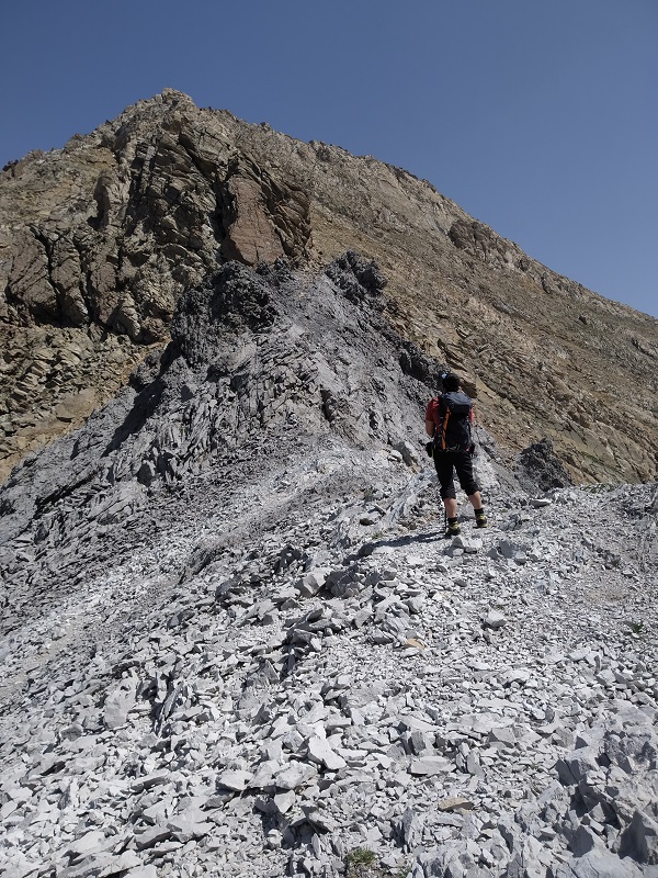 La arista se aplana y en el centro una pared nos corta el paso. Vemos unos hitos a la izquierda que nos permiten progresar por terreno sencillo.
