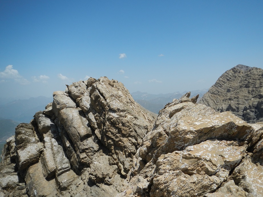 La arista suroeste, siguiendo los hitos, tiene pasos de IIº+. Quizás algún IIIº- aislado. No es evidente y deberemos buscar el mejor camino en algunos puntos. De buena roca en general, prestaremos atención a algunos bloques que se mueven.
