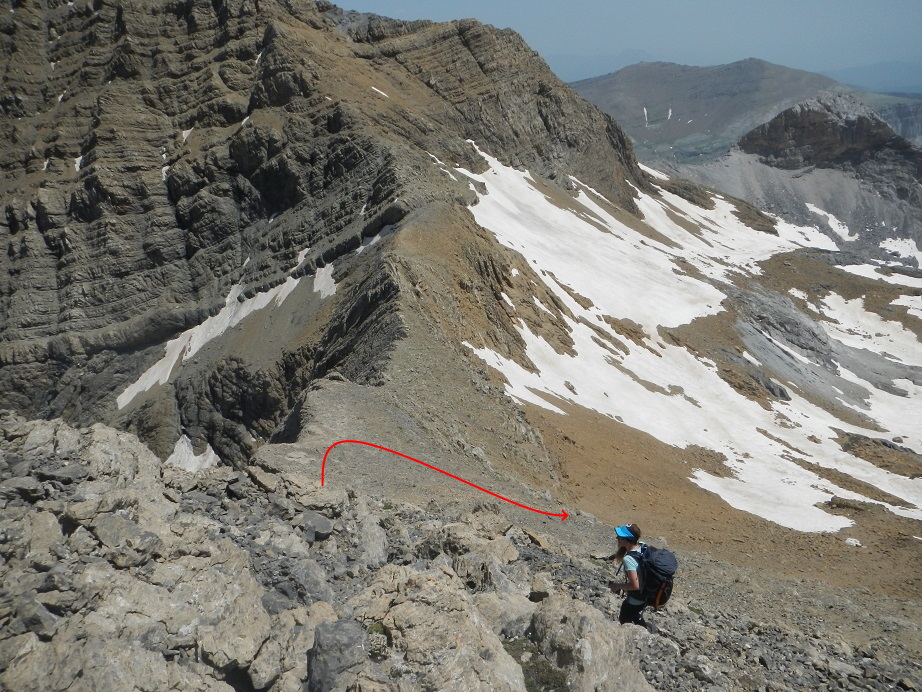 Hay que estar atentos a unos hitos que descienden hacia el barranco de Gabieto, y donde realizamos unos sencillos destrepes.