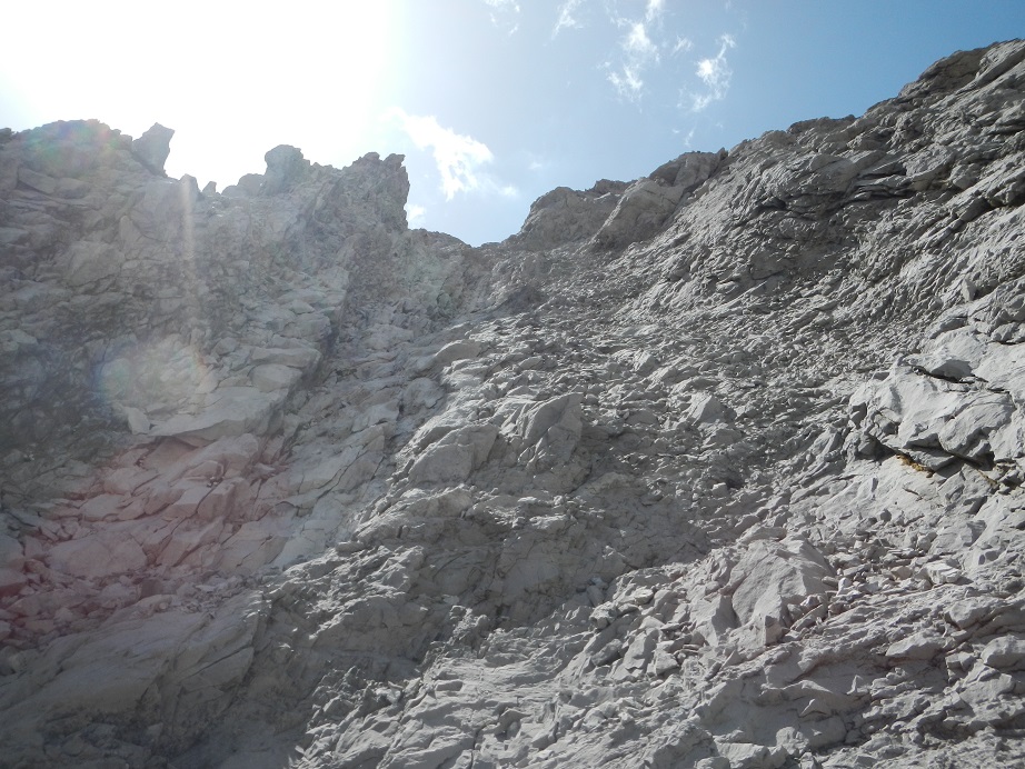 Ascendemos un tramo de roca descompuesta pegados a la derecha para ayudarnos con las manos.