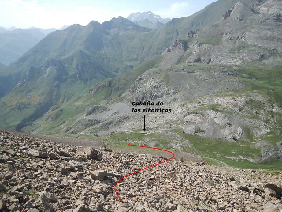 Volvemos a la pedrera por la que ascendimos por la mañana, al fondo podemos ver la cabaña de las Eléctricas.