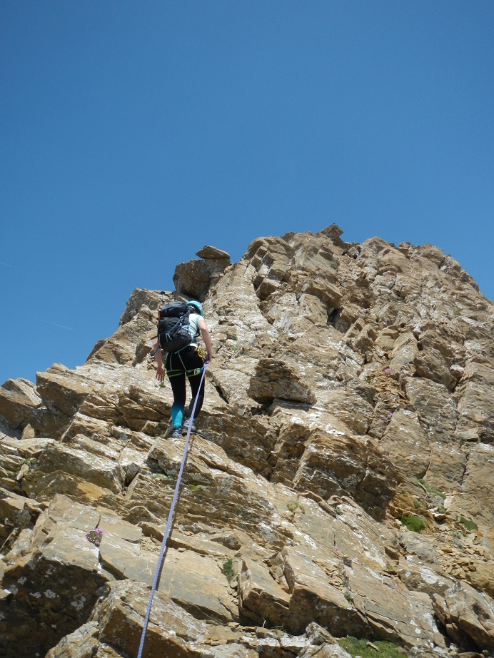 Comenzamos caminando por la veta gris y cuando la roca cambia de color, rodeamos el primer gendarme por la derecha, entrando en un pequeño corredor que nos deposita en el centro de la arista.